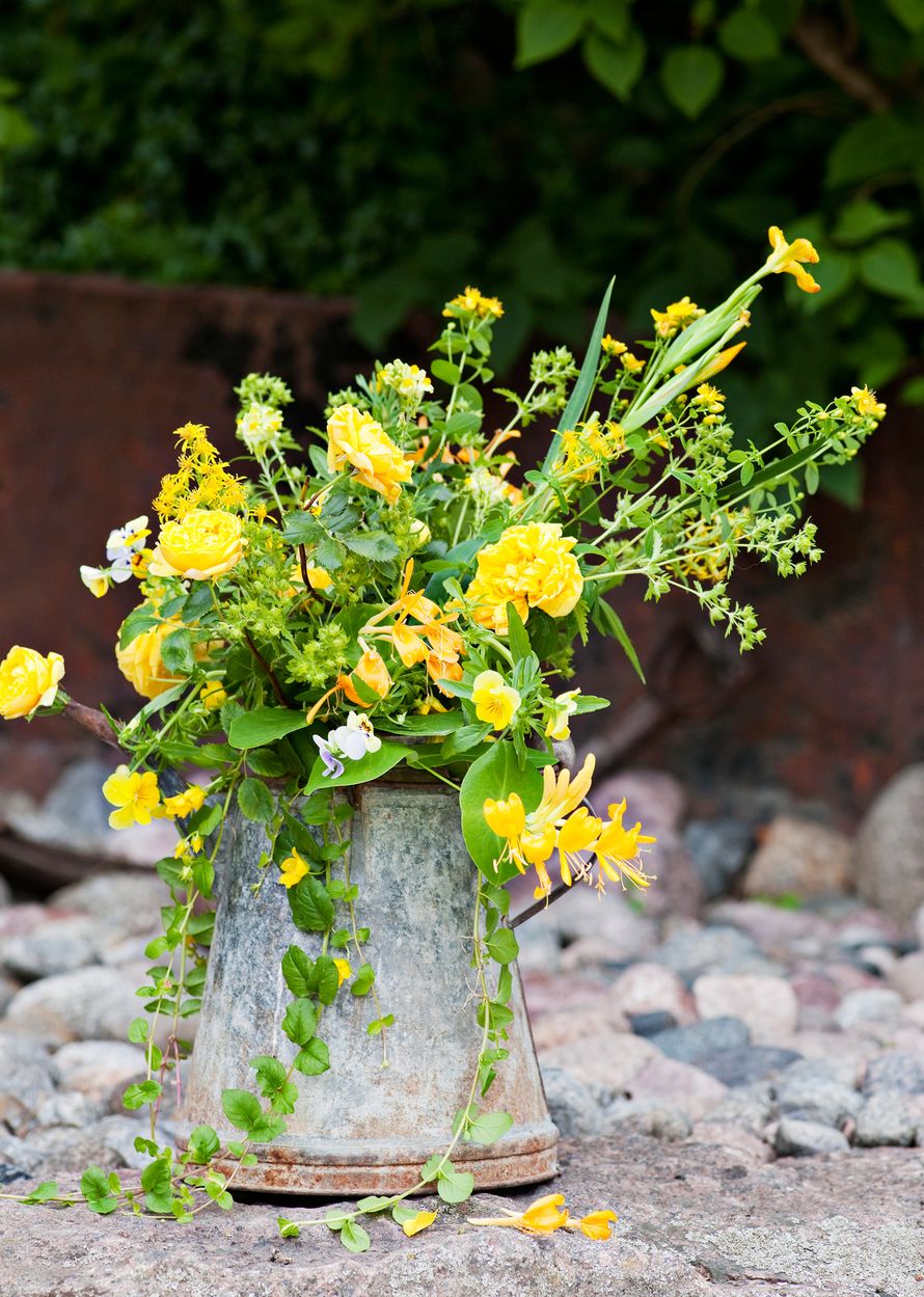 Puutarhasta kerätyistä keltaisista kukista koottu sekakimppu sopii vanhaan, patinoituneeseen kastelukannuun. Kimppuun sopivat vaikkapa orvokit, ruusut, tuoksuköynnöskuusama, keltakurjenmiekka ja tarha- tai suikeroalpi.