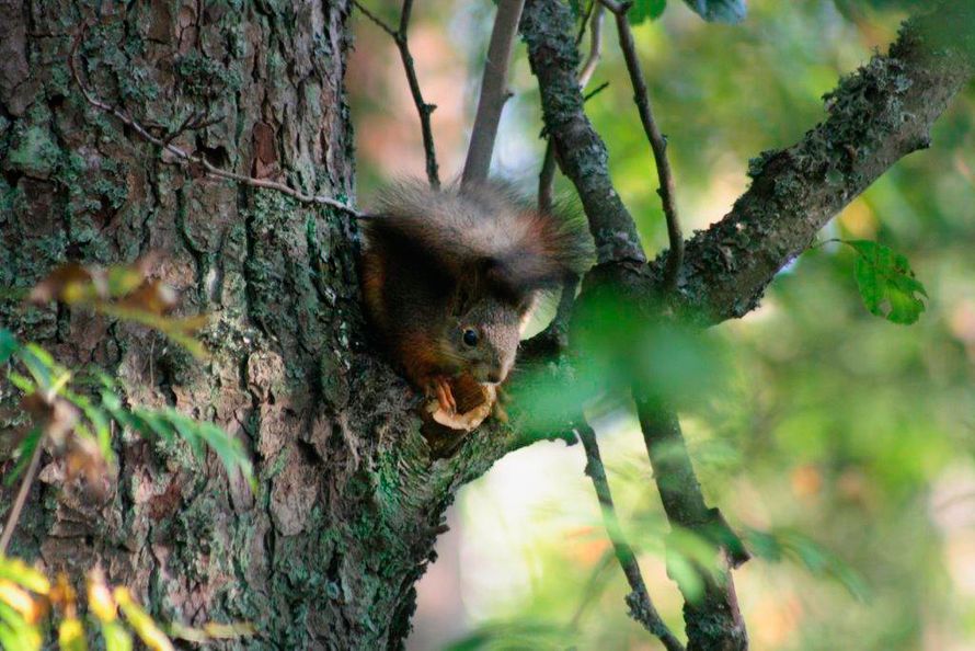 Pihapuusta katsoi nuori, pörröhäntäinen orava, jolla oli jotain mukanaan. Mutta mitä?