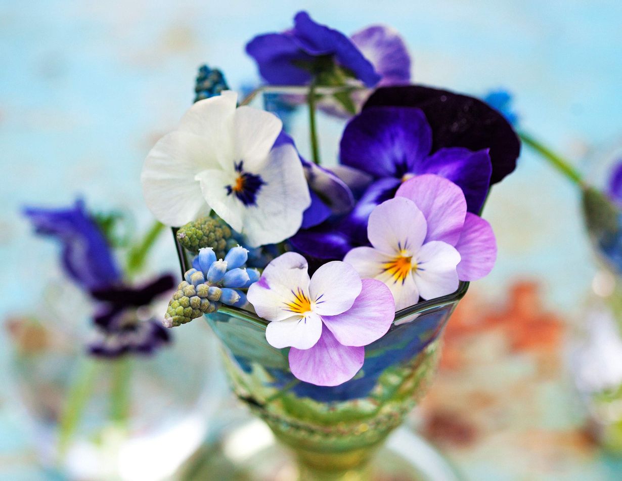 Valitse orvokki, joka on lempiväriäsi, ja saat luotua juhlapöydälle mieleisesi ilmeen. Pienet kevätkukat ja eriväriset maljakot tekevät kattauksesta iloisen.