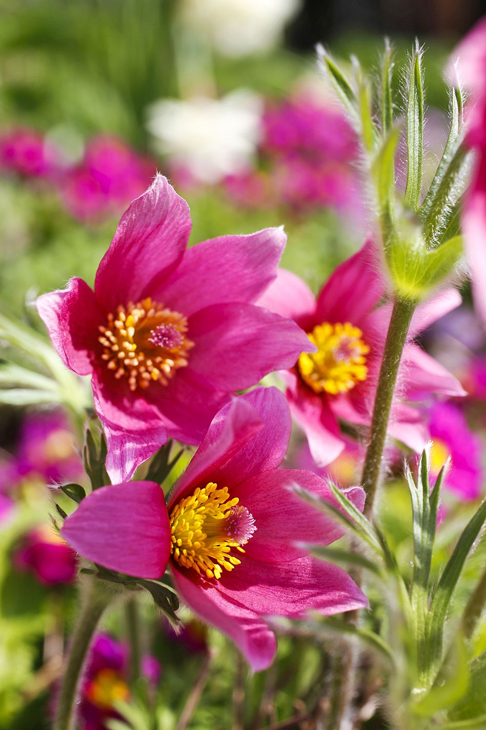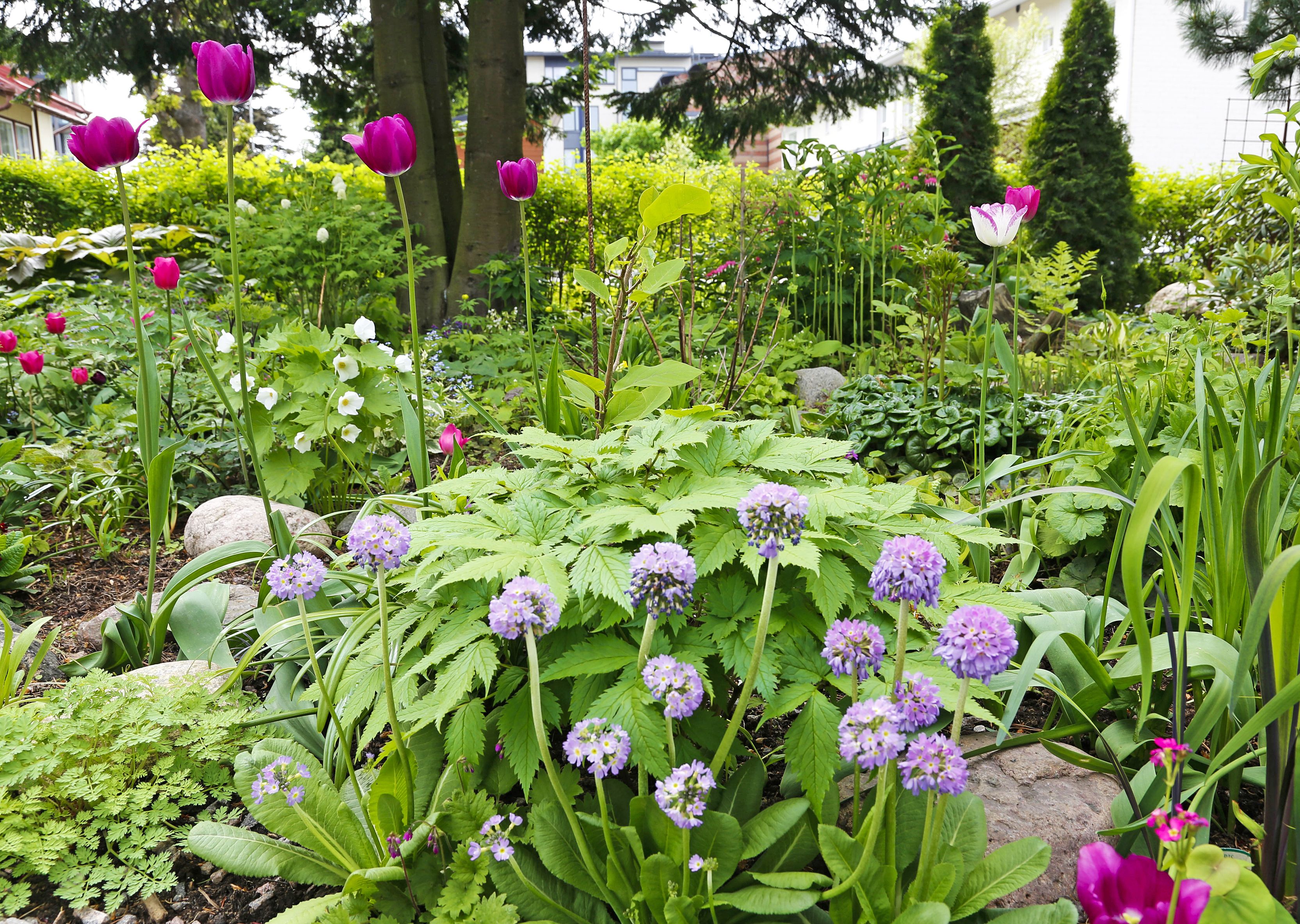 Perennapenkkien aaltoilevilla reunoilla kukkivat hillityt vuokot, jouluruusut, sinikämmenet ja kylmänkukat. Niitä ei ensin juuri huomaa, sillä joukosta nousevat esiin satojen kevätesikoiden kirkkaat huomiovärit.