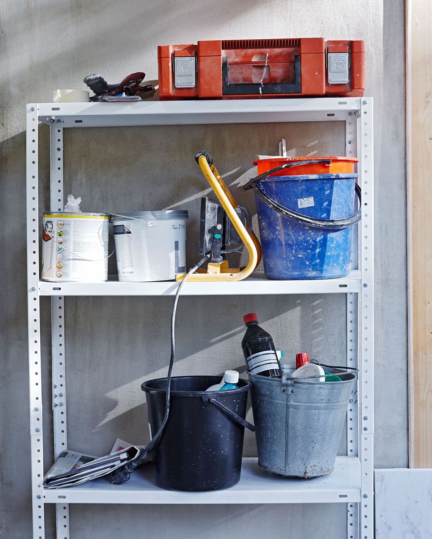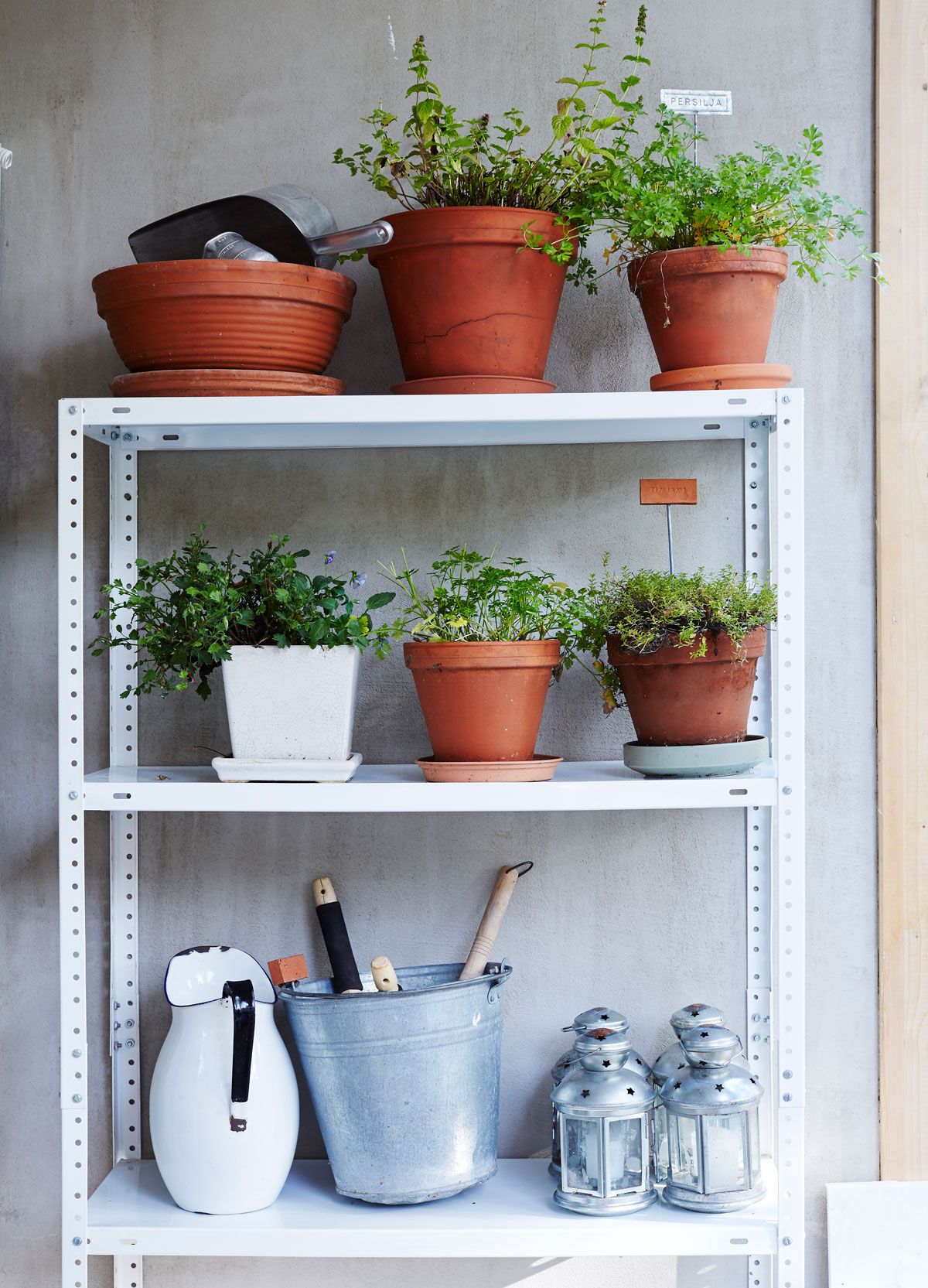 Rautakaupoissa myytävät varastohyllyt soveltuvat hyvin myös ulkokäyttöön. Suoraa vesisadetta ne eivät kestä, mutta katoksen alla ne sopivat mainiosti. Riittävän harva hyllyväli pitää huolen, että kasvit saavat riitttävästi valoa hyllyssä. Alimmille hyllyille voi sijoittaa koreihin tai laatikoihin muuta puutarhatavaraa.