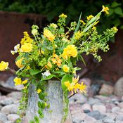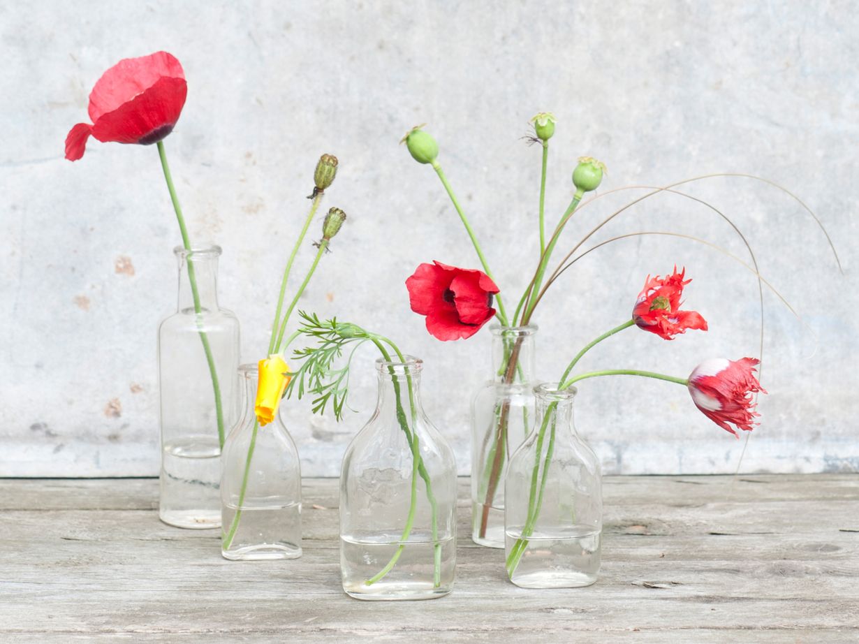 Vanhat lasipullot, tölkit ja kannut ovat mainioita maljakoita. Löytöjä voi tehdä esimerkiksi kirpputoreilta.