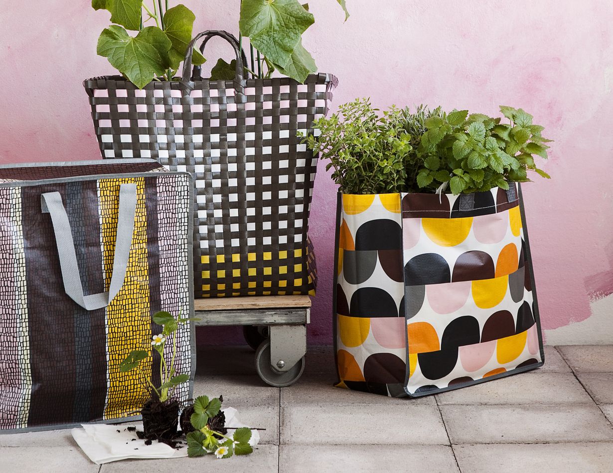3. Vuoraa punottu kauppakassi ennen mullan laittoa jätesäkillä, jotta kassi pysyy siistinä. Kastelu on huolettomampaa, jos leikkaat pienet reiät sekä kassin että jätesäkin pohjaan.