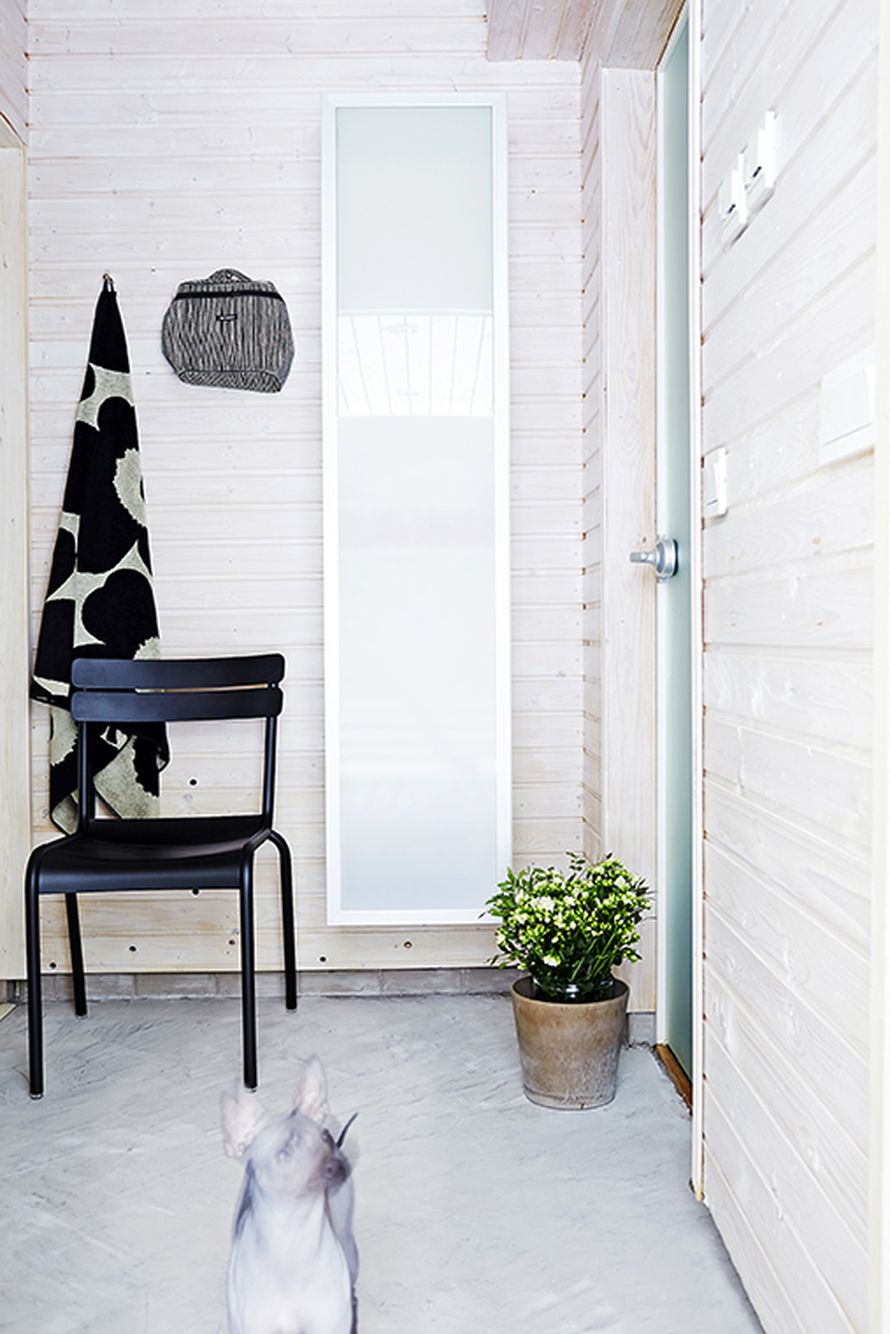 Saunani pikku pukuhuoneen sininen laatoitus, joka häiritsi silmiäni vuosia, on nyt peitetty. Mikrosementillä pieni saunanporstua sai ihan uudenlaisen, karunkauniin hengen.