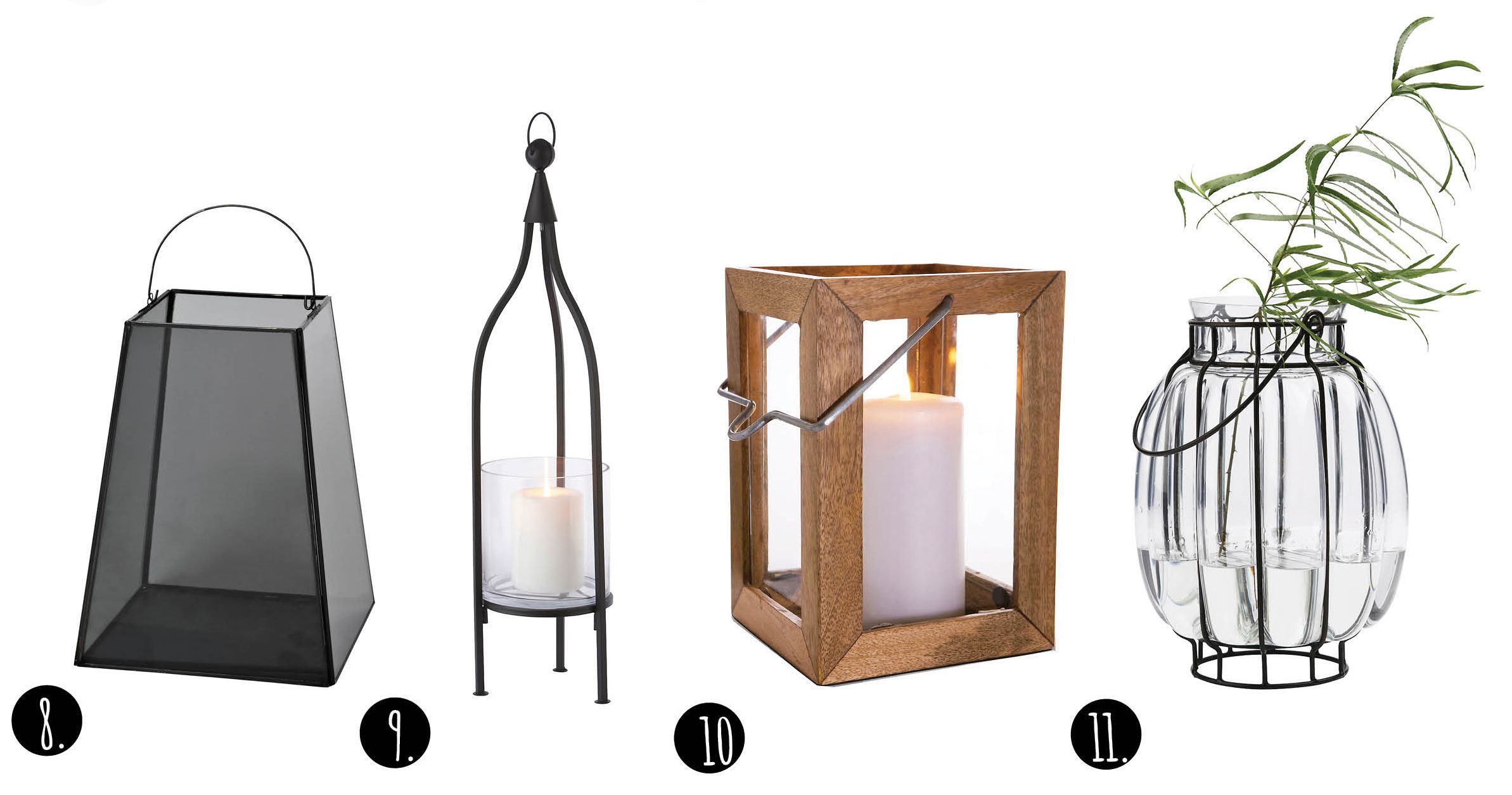 8. Brosten Ingrid-kynttilälyhty, korkeus 20 cm, 56 e, Royal Design. 9. Tropic-rautalyhty, korkeus 77 cm, 55,90 e, Jotex. 10. Mangopuinen Tofta-lyhty, korkeus 22 cm, 17,90 e, Jotex. 11. Suupuhallettu Svanedal-lyhty on kaunis myös maljakkona, 49,90 e, Jotex.