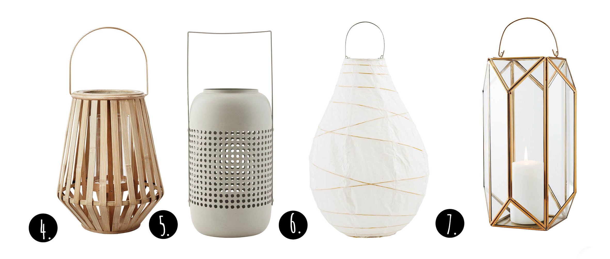 4. Ragnar-bambulyhty, korkeus 30 cm, 29,50 e, Hemtex. 5. House Doctorin Panel-metallilyhty, korkeus 28 cm, 35 e, Olkkari. 6. Drop-lyhty, korkeus 30 cm, 6 e, Royal Design.fi. 7. Sofi-messinkilyhty, korkeus 30 cm, 39,95 e, Hemtex.