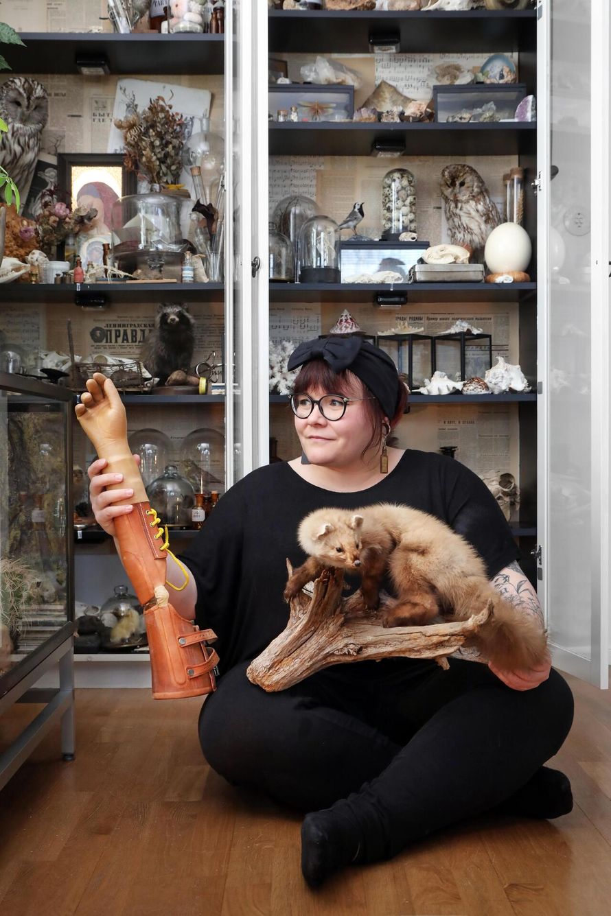Moni pitää makaabereja esineitä pelottavina ja luotaantyöntävinä, mutta itse koen vanhat lääketieteelliset esineet ja täytetyt eläimet kiehtovina paloina historiaa. Muun muassa käsin maalatut, lasiset silmäproteesit ovat uskomatonta taidetta, jolla on ollut suuri merkitys käyttäjälleen. Kallot, luut ja perhoset kertovat uteliaisuudestani ja kunnioituksestani luontoa kohtaan.”