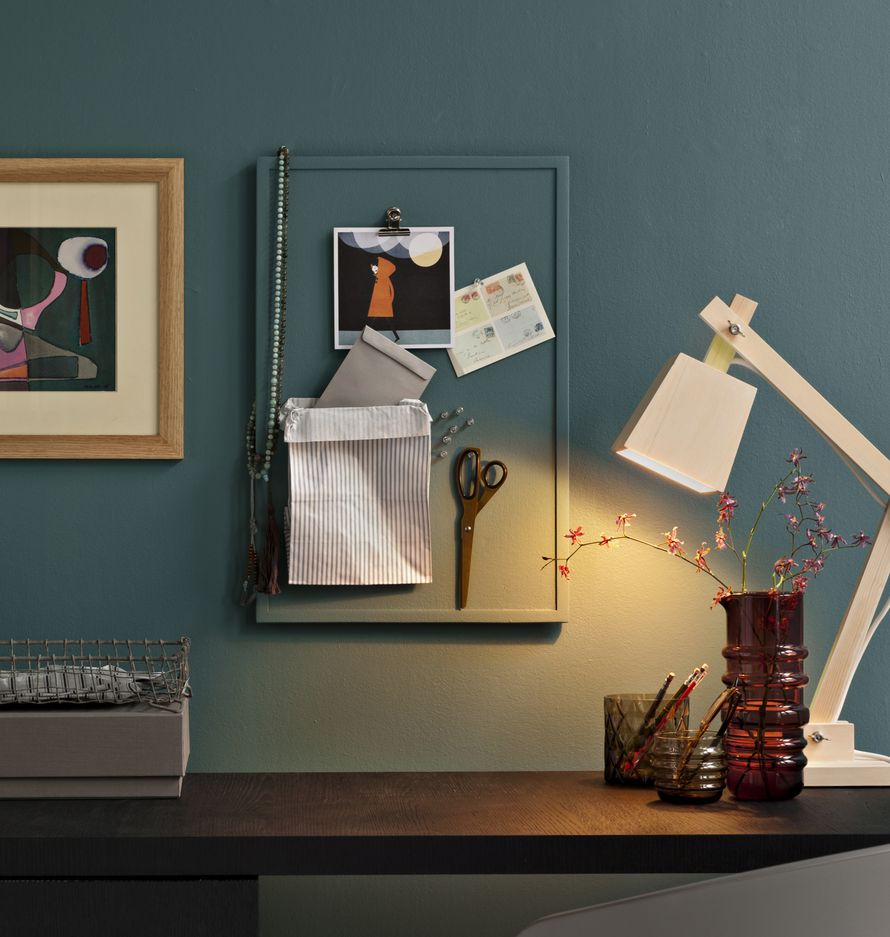 Kotikonttorin valkoiset seinät saivat kyytiä, kun työpisteeseen haluttiin saada väriä ja tyyliä. Sekä seinä että Ikean Väggis-ilmoitustaulu, 4,99 e, maalattiin samalla maalilla: Tikkurilan täyshimmeällä Harmonylla, sävy L441. Edullinen ilmoitustaulu maastoutuu nyt täydellisesti tummanvihreään seinään.