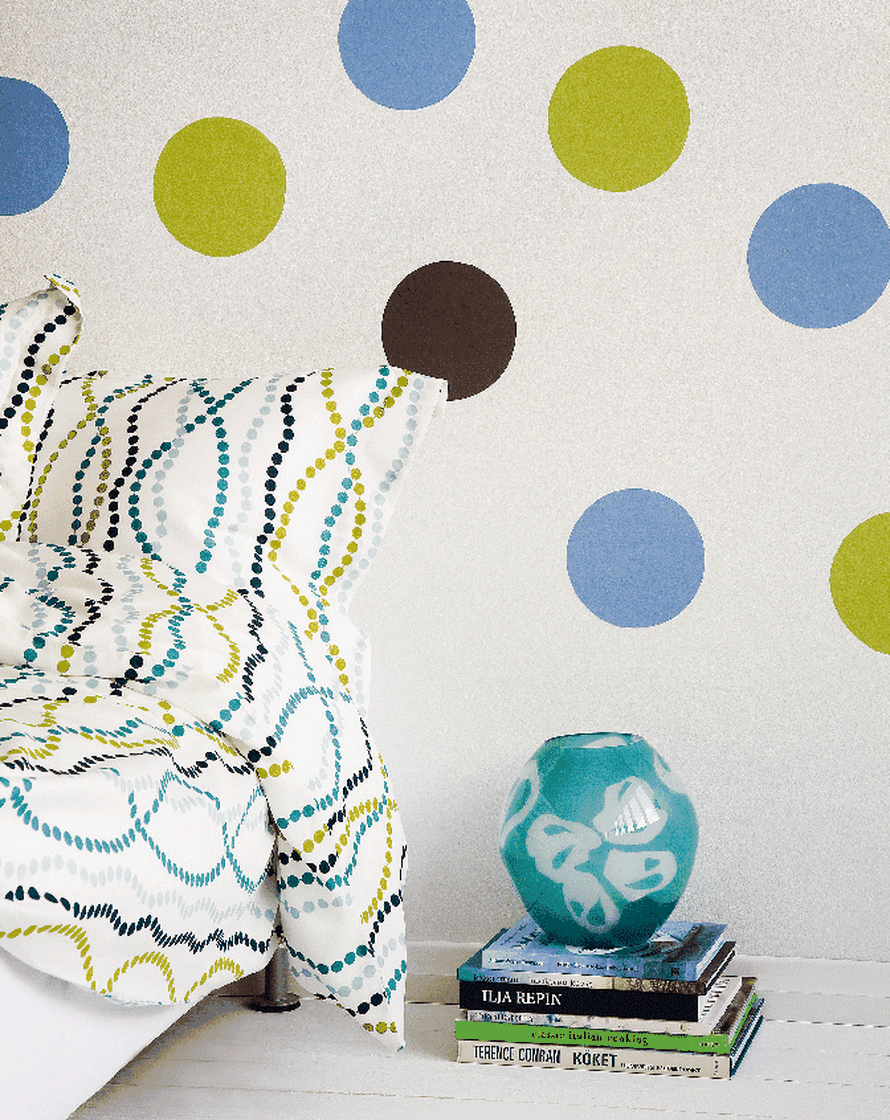 Leikkaa vanhoista tapetinjämistä lautasta apuna käyttäen erivärisiä palloja ja kiinnitä ne liisterillä suoraan puhtaaseen seinään. Jos pallot myöhemmin kyllästyttävät, ne on helppo irrottaa vedellä kostuttamalla.