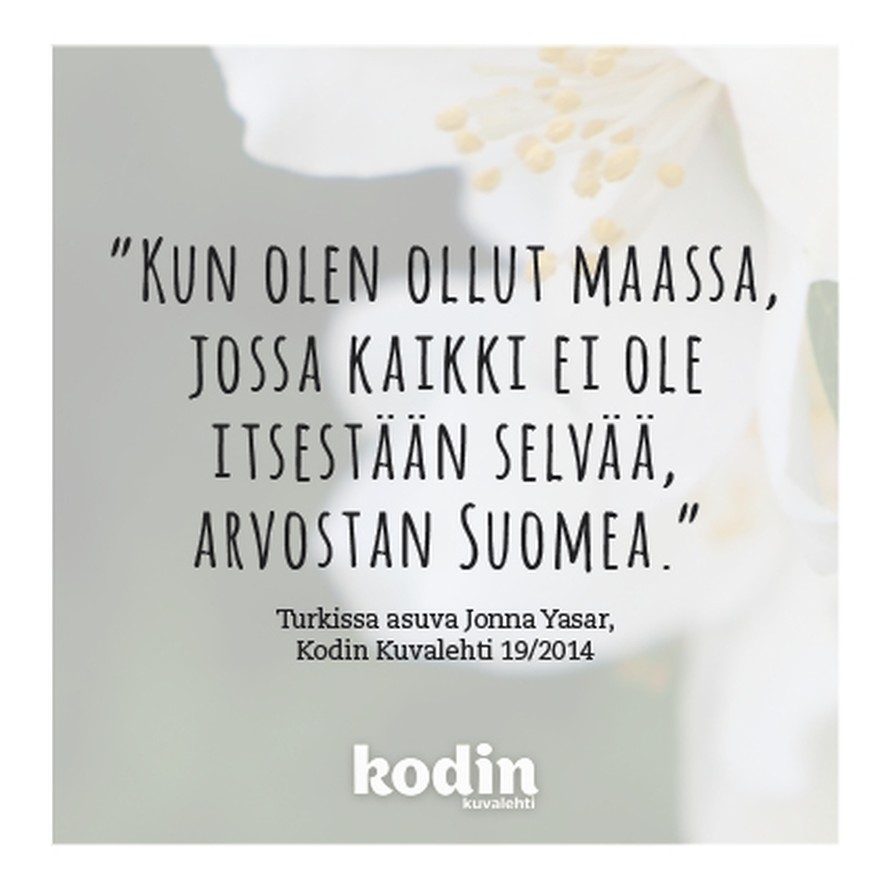 Kotimaan arvostamisesta 21.1.2015 klo 18:17 "Kun olen ollut maassa, jossa kaikki ei ole itsestään selvää, arvostan Suomea." Turkissa asuva Jonna Yasar, KK19/2014 Mitä mieltä olet? Kommentoi ja kerro. Tilaa Kodin Kuvalehti voimalause Tilaa Lue digilehtenä