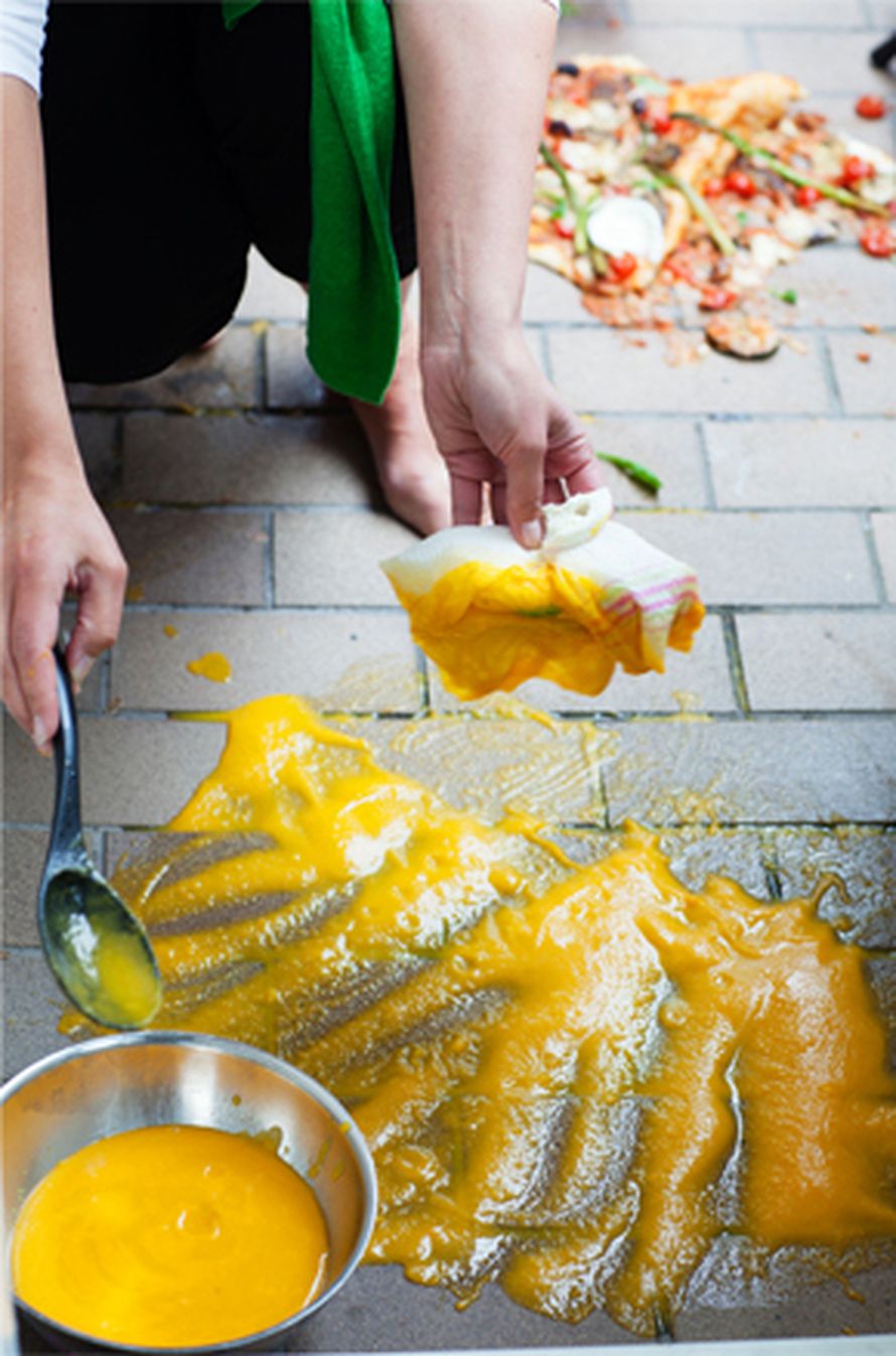 Kilpailun voittaja Tove Hjort tuli meille kotiin kuvattavaksi. Kaikki alkoi hyvin, kunnes minä töpeksin. Kannoin uunikuumaa pizzaa leikkuulaudalla parvekkeelle Toven käsiin, kun se tapahtui. En nähnyt enkä muistanut 4 litran porkkanakeittokattilaa heti parvekkeen oven edessä lattilla. Niinpä astuin kattilan kahvalle, jolloin kattila luonnollisesti kaatui ja kaikki keitto valui parvekkeen lattialle. Samalla hetkellä leivinpaperin päällä oleva pizza luisui lennossa lattialle.