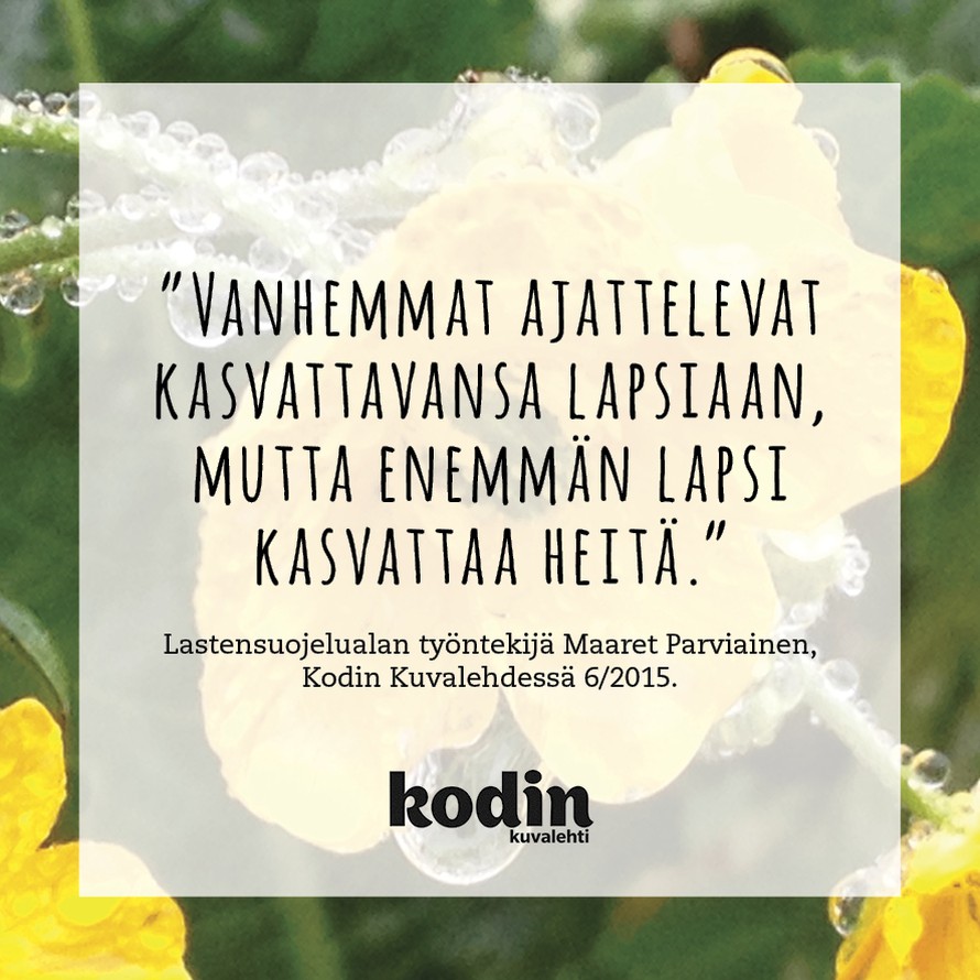 Kumpi kasvattaa kumpaa? 6.6.2015 klo 10:30 ”Vanhemmat ajattelevat kasvattavansa lapsiaan, mutta enemmän lapsi kasvattaa heitä.” Lastensuojelualan työntekijä Maaret Parviainen, KK6/15. Tilaa Kodin Kuvalehti voimalause Tilaa Lue digilehtenä