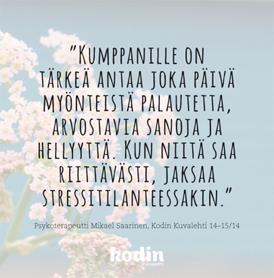 Kumppanin arvostuksesta 12.9.2014 klo 7:24 Tilaa Kodin Kuvalehti ajatus oivallus voimalause Tilaa Lue digilehtenä