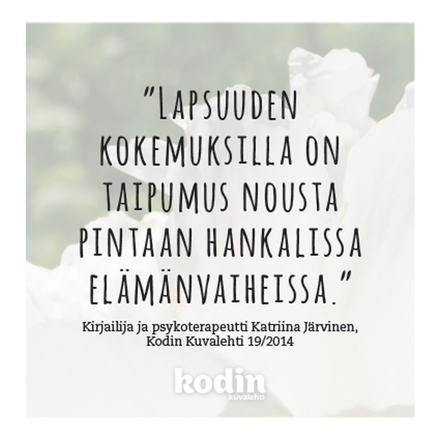 Lapsuuden kokemukset nousevat pintaan 25.1.2015 klo 18:14 "Lapsuuden kokemuksilla on taipumus nousta pintaan hankalissa elämäntilanteissa." Psykoterapeutti Katriina Järvinen, KK19/2014 Mitä mieltä sinä olet? Kommentoi ja kerro. Tilaa Kodin Kuvalehti voimalause Tilaa Lue digilehtenä