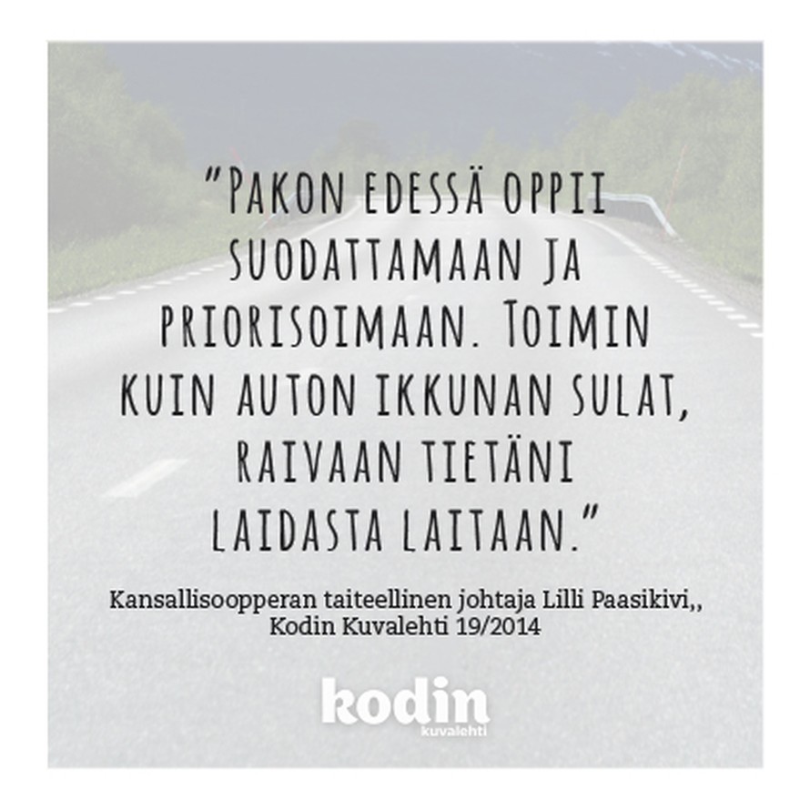"Pakon edessä oppii suodattamaan ja priorisoimaan. Toimin kuin auton ikkunan sulat, raivaan tietäni, laidasta laitaan." Kansallisoopperan johtaja Lilli Paasikivi, KK19/2014