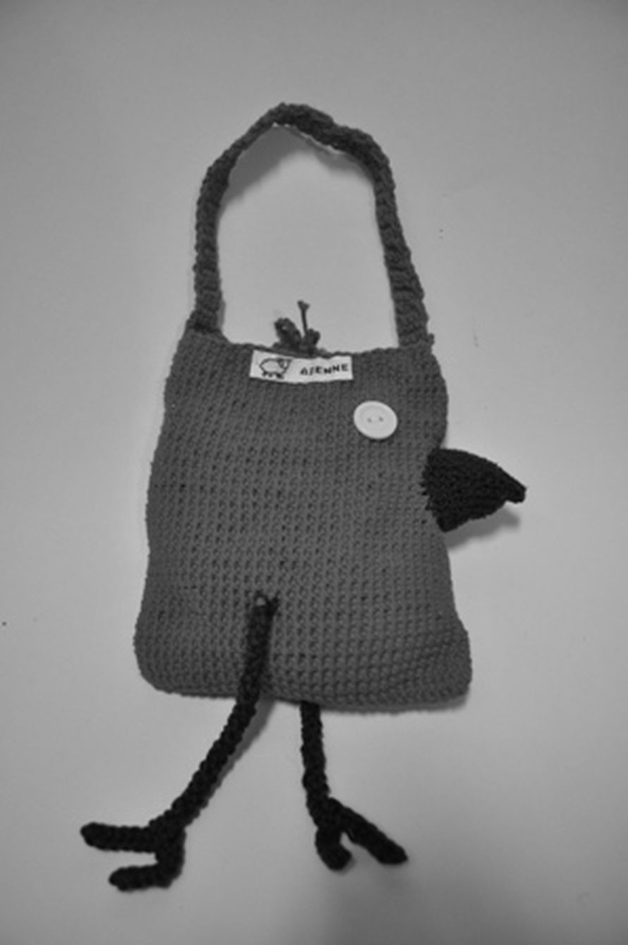 Virkkaamalla toteutettu laukku, jonka nokkaosa on pehmustettu vanulla. Silminä kierrätysnapit. Laukun kiinnitys tapahtuu nyörit solmimalla. Linnun jalat heiluvat hauskasti samaan tahtiin laukun kantajan kanssa.