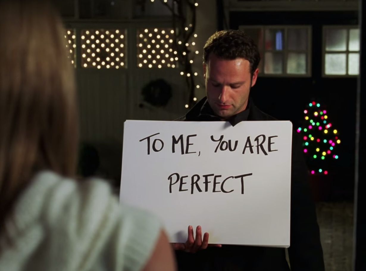 Rakkautta vain on ihana elokuva. Sen ikimuistoisimmassa kohtauksessa parhaan ystävänsä vastavihittyyn vaimoon salaa rakastunut Mark (Andrew Lincoln) saapuu pariskunnan ovelle mukanaan rakkauttaan julistavat pahvikyltit. Vaimo avaa oven ja Mark tunnustaa tunteensa äänettömästi kylttejä pidellen. Miten romanttista.