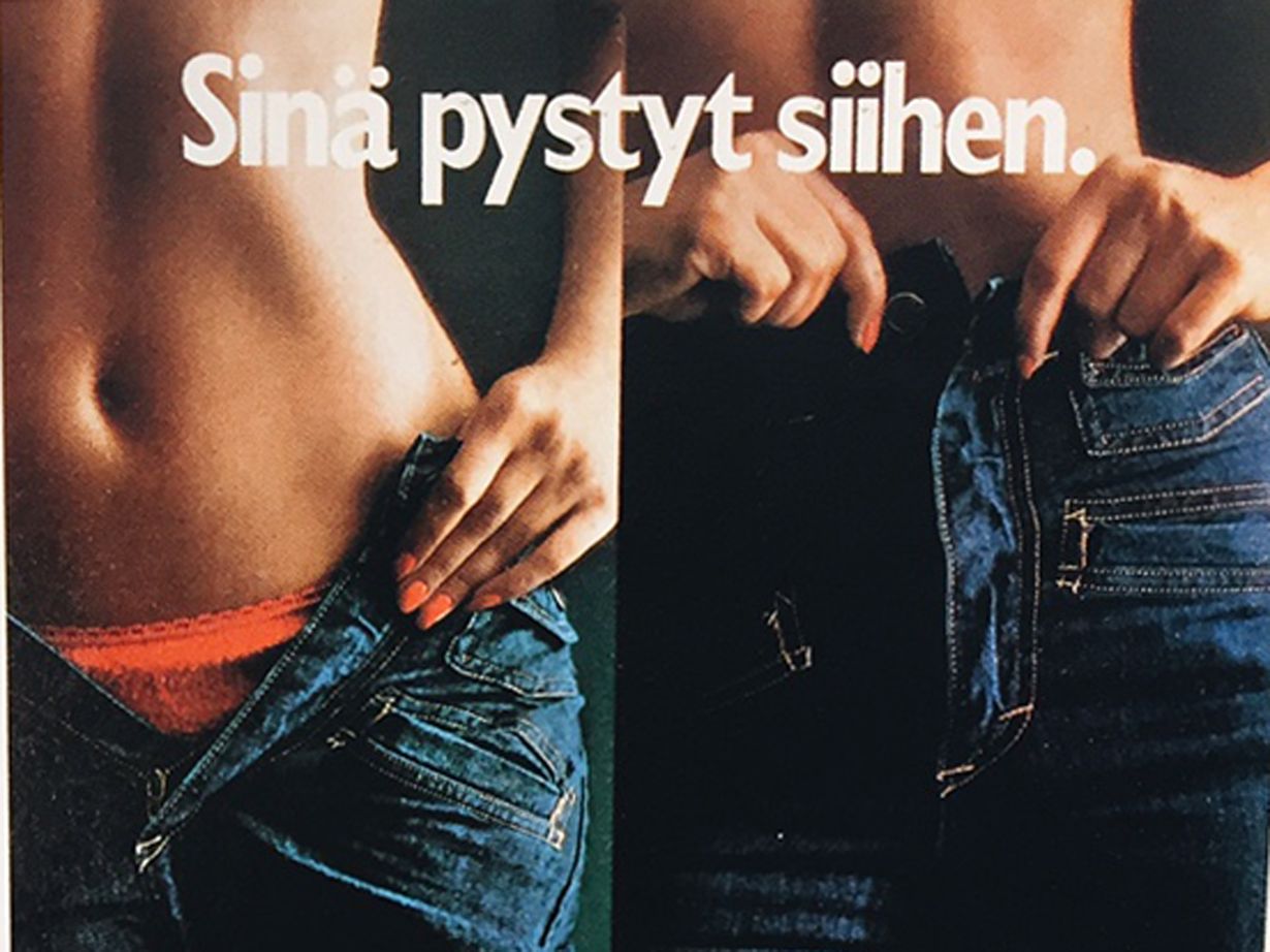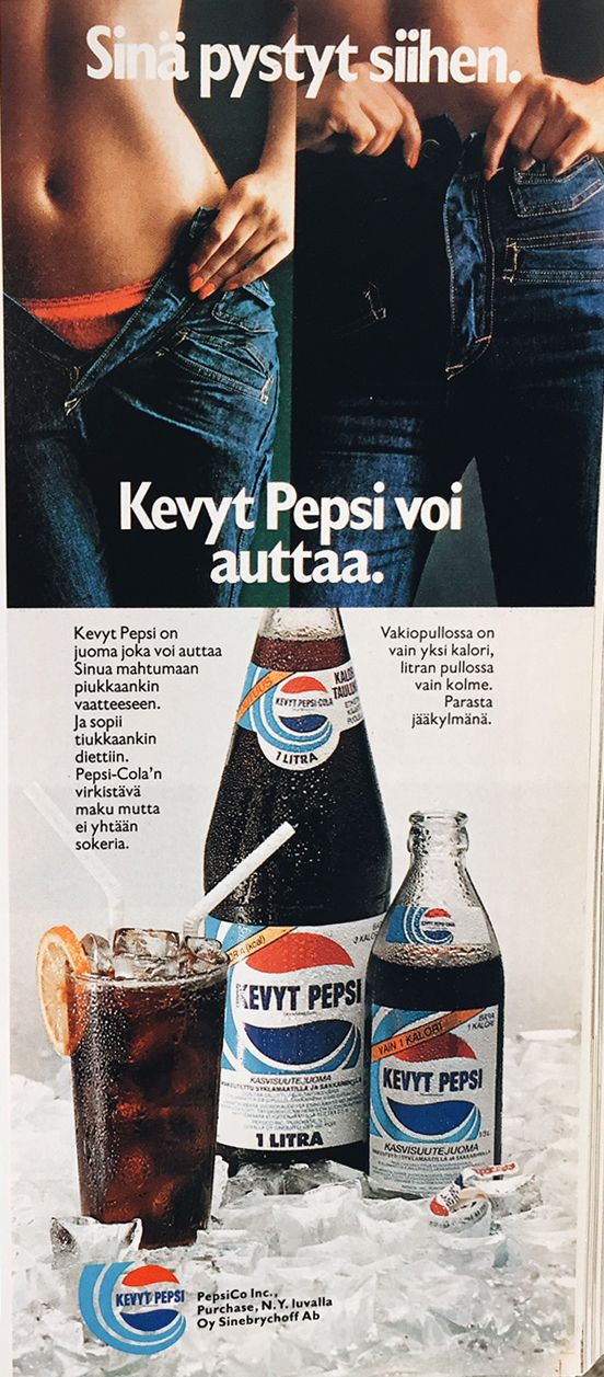 ...vaan limsaa! Vuonna 1978 Kevyt Pepsiä mainostettiin lupauksella, että se auttaa juojaansa mahtumaan piukkoihinkin vaatteisiin.