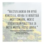Asiantuntijana Lääkärikeskus Aava Pasilan työterveyspsykologi, psykoterapeutti Miia Rautiainen ja tiedostavan kirjoittamisen valmentaja Sanna Wikström. Jutussa on käytetty lähteenä myös Annastina Vrethammarin kirjaa Ajattele elämäsi hyväksi (Tammi 2009).