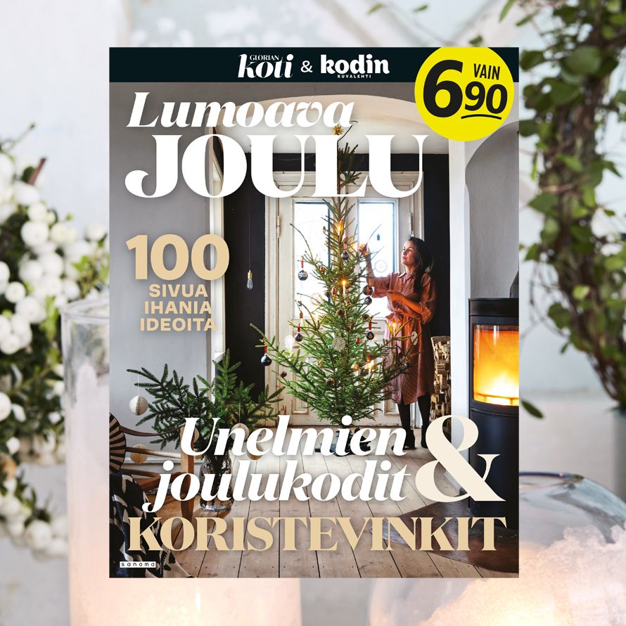 Kodin Kuvalehden ja Glorian kodin yhteinen erikoisjulkaisu Lumoava joulu esittelee hurmaavia joulukoteja lehtien menneiltä vuosilta sekä kaksi ennen julkaisematonta tarinaa. Mukana on myös kauneimpia koristeluideoita kotiin sekä tee itse -ohjeita. Nappaa siis mukaasi 100 sivua ihanaa joulutunnelmaa!