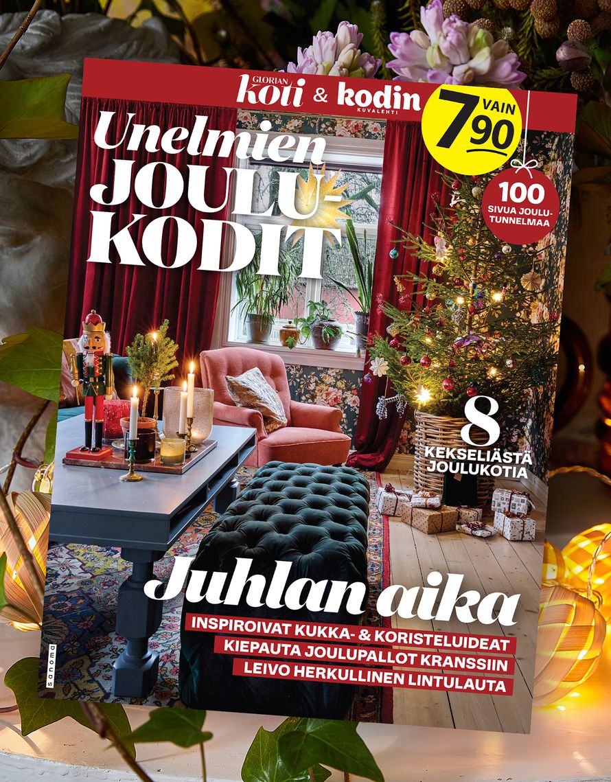 Kodin Kuvalehden ja Glorian kodin yhteinen erikoisjulkaisu Unelmien joulukodit esittelee hurmaavia joulukoteja lehtien menneiltä vuosilta sekä ennen julkaisemattomia tarinoita. Mukana on myös kauneimpia koristeluideoita kotiin sekä tee itse -ohjeita. Nappaa siis mukaasi 100 sivua ihanaa joulutunnelmaa!