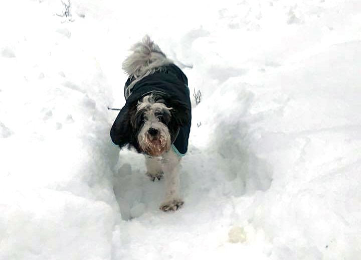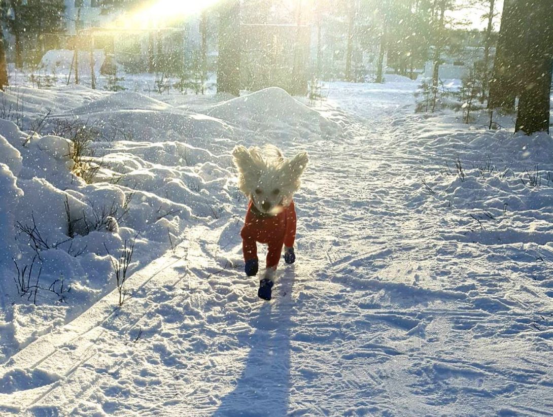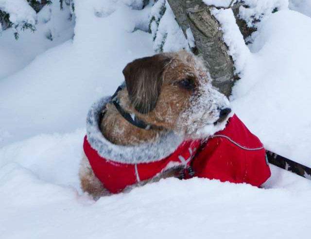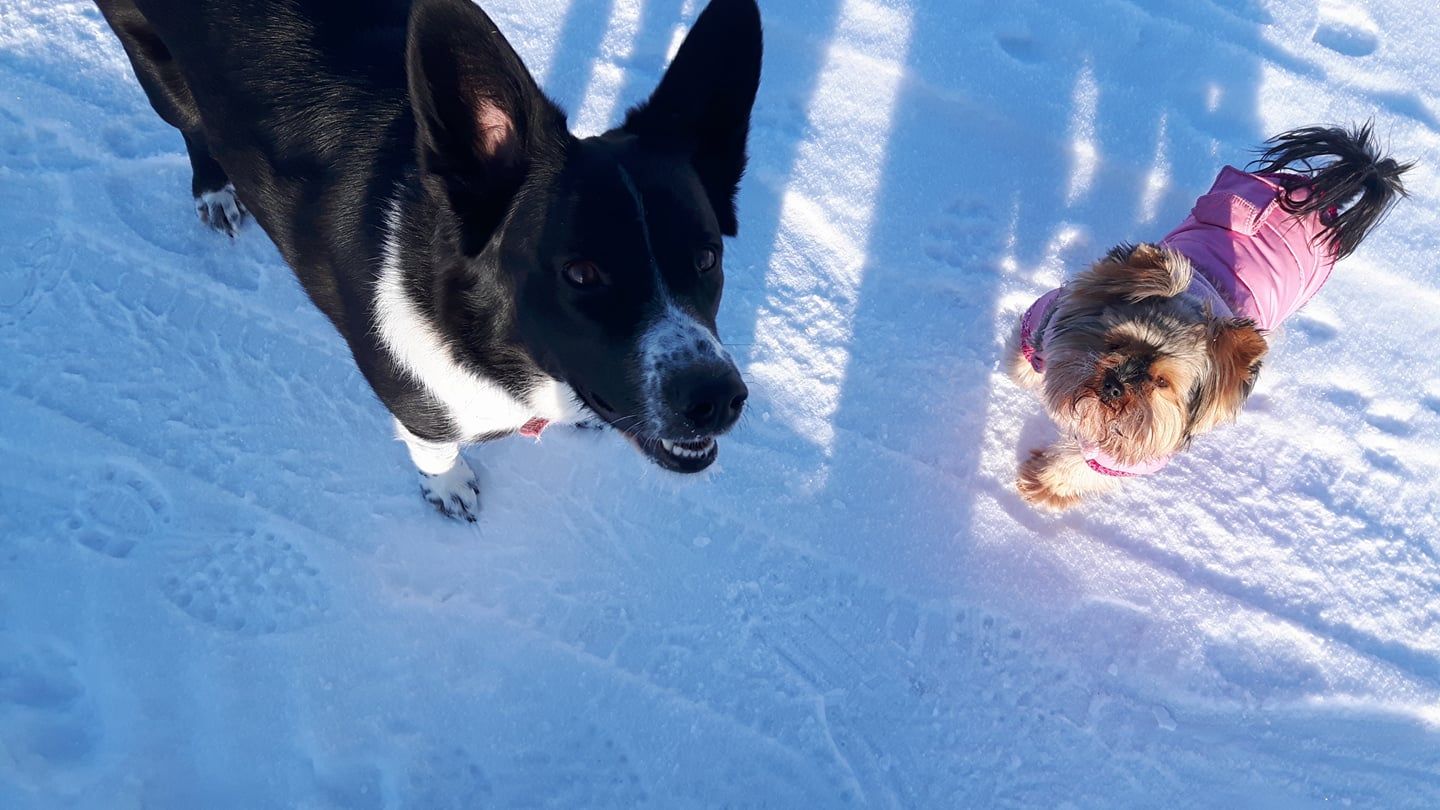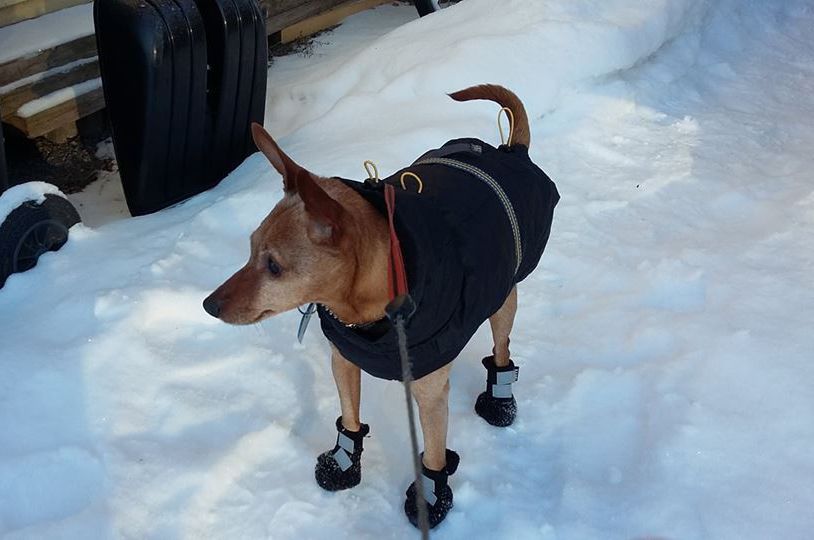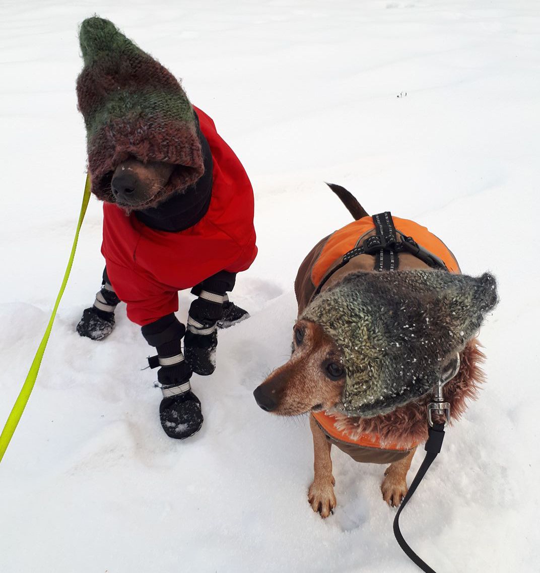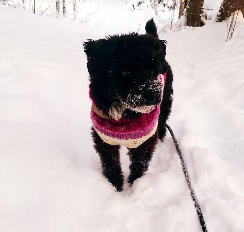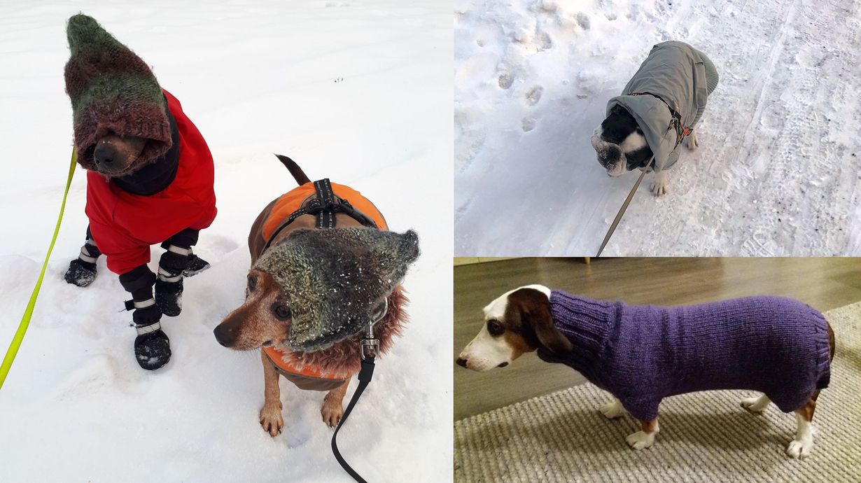 Katso hassut kuvat koirien pakkasmuodista: Nuuskalla pipo silmillä ja Lotalla hohtoneule