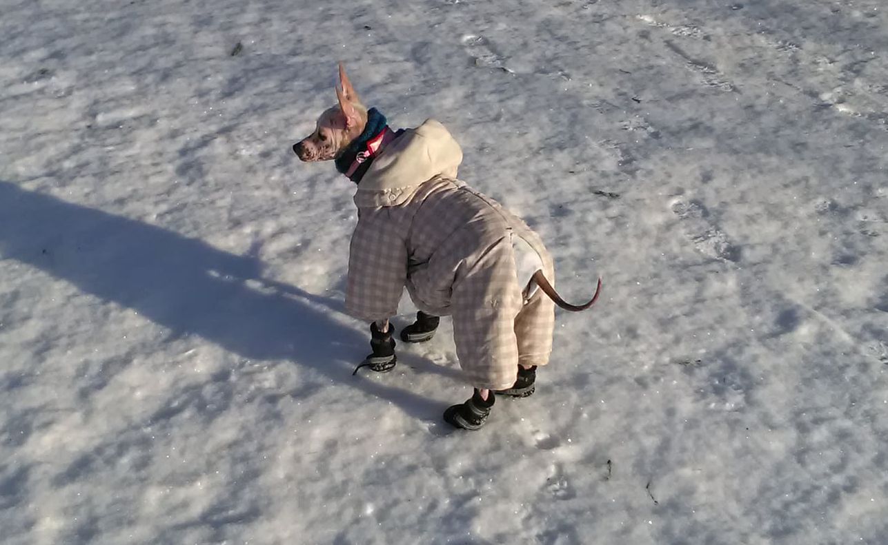 ”Haalari ja tossut pitävät meidän nakut kiinanharjakoirat lämpiminä, vaikka koirat eivät kovin mielellään kylmällä säällä ulos lähdekään. Kuvassa Zinnystar Barking Brownie eli Bono.” – Sanna-Maria Timperi