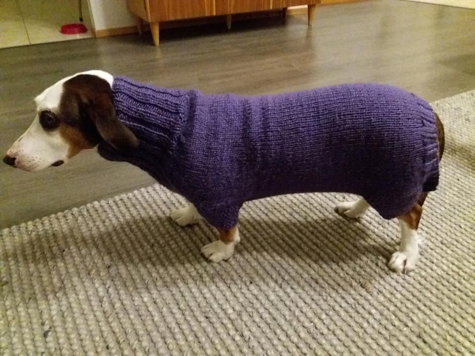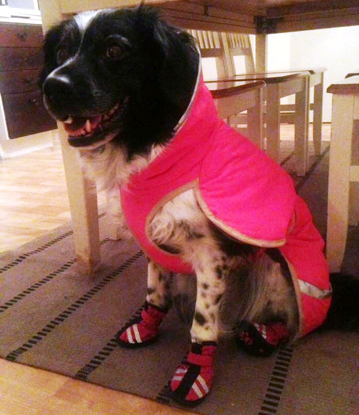 ”Dreeverinarttu Lottaa ei enää palele lenkillä, koska hyvä ystävä kutoi sille neulepuvun hohtavasta langasta. Pimeällä puku loistaa hienosti otsalampun valossa!” – Mirva Ukkola