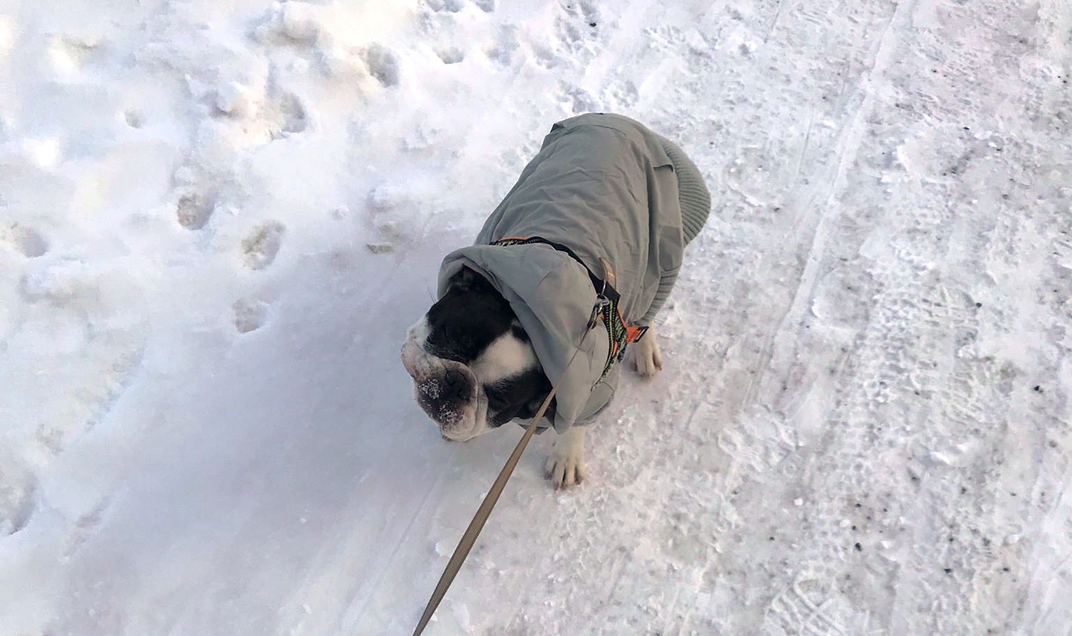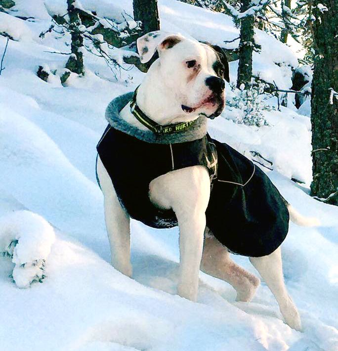 ”Urho on puolivuotias amerikanbulldog, joka viihtyy hyvin talvitakki päällä.” – Mervi Mykkänen
