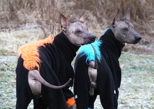 ”Meksikonkarvatonkoirat Gael ja Fuego esittelevät nakukoirien haalarimuotia. Näillä pakkasilla niille puetaan myös tossut. Koirat viihtyvät hyvin vaatteissaan.” – Nina Virtanen