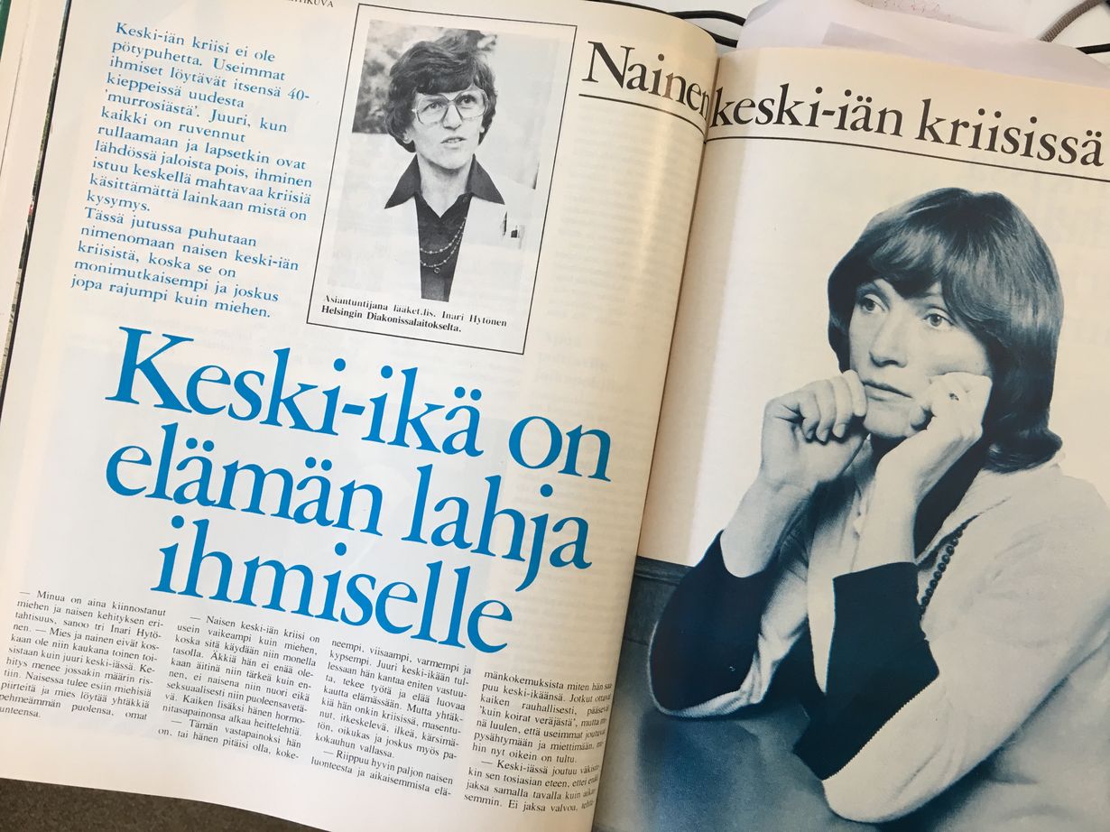 "Äkkiä hän ei olekaan äitinä niin tärkeä kuin ennen, ei naisena niin nuori eikä seksuaalisesti niin puoleensavetävä. Kaiken lisäksi hänen hormonitasapainonsa alkaa heittelehtiä", sanoi jutussa haastateltu lääketieteen lisensiaatti Inari Hytönen.