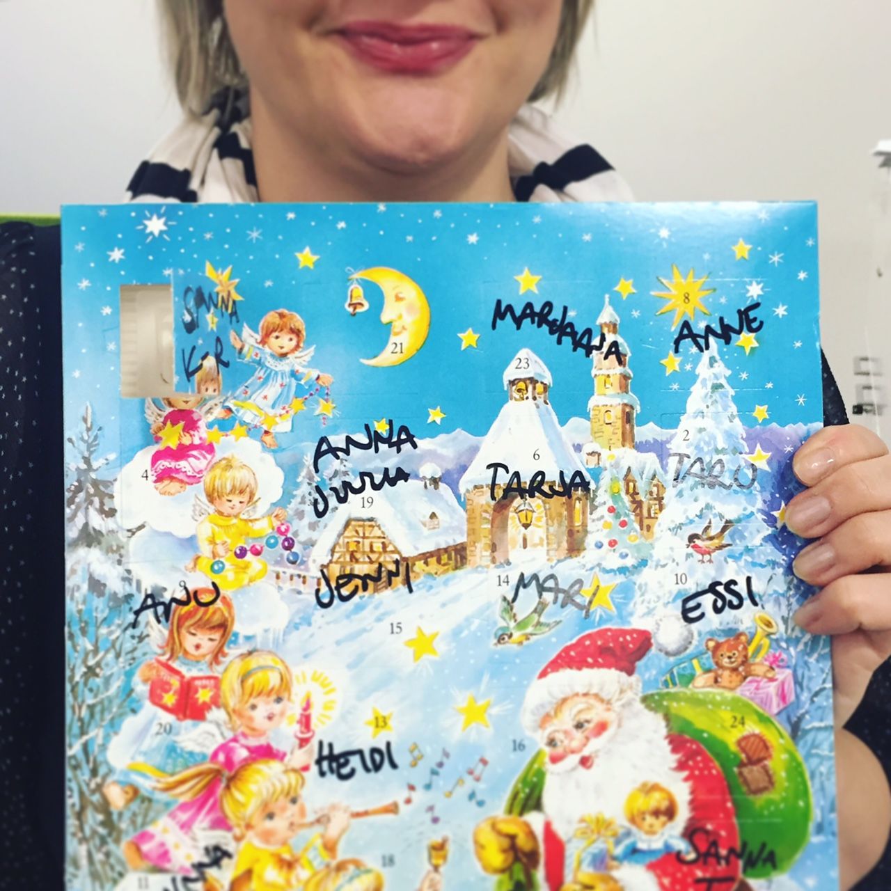 Kodin Kuvalehden toimituksen yhteisessä joulukalenterissa on luukku jokaiselle ja muutama nimetön, jotka nopein saa avata. Suklaata rakastavan toimituksen kalenteri maksoi vain euron!