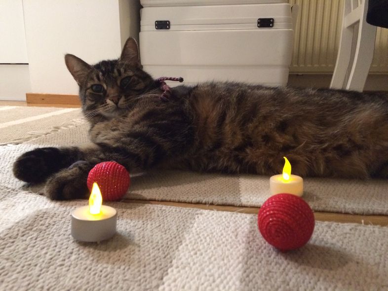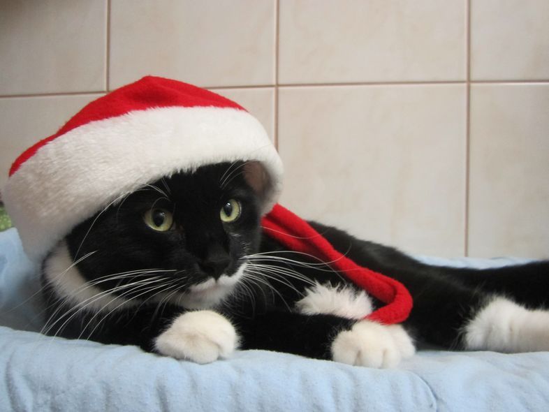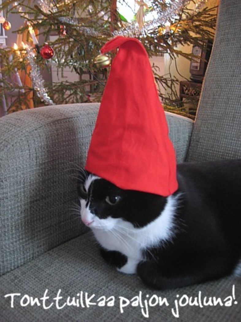 Kahteen pekkaan kuvattiin, ja minä sain nostaa tonttulakin kissan päähän ainakin 25 kertaa ennen kuin sisko sai onnistuneen kuvan. Kissa ei kertaakaan hermostunut, tyynesti vain hieman nyökkäsi päätään ja tiputti lakin. - ElinaA