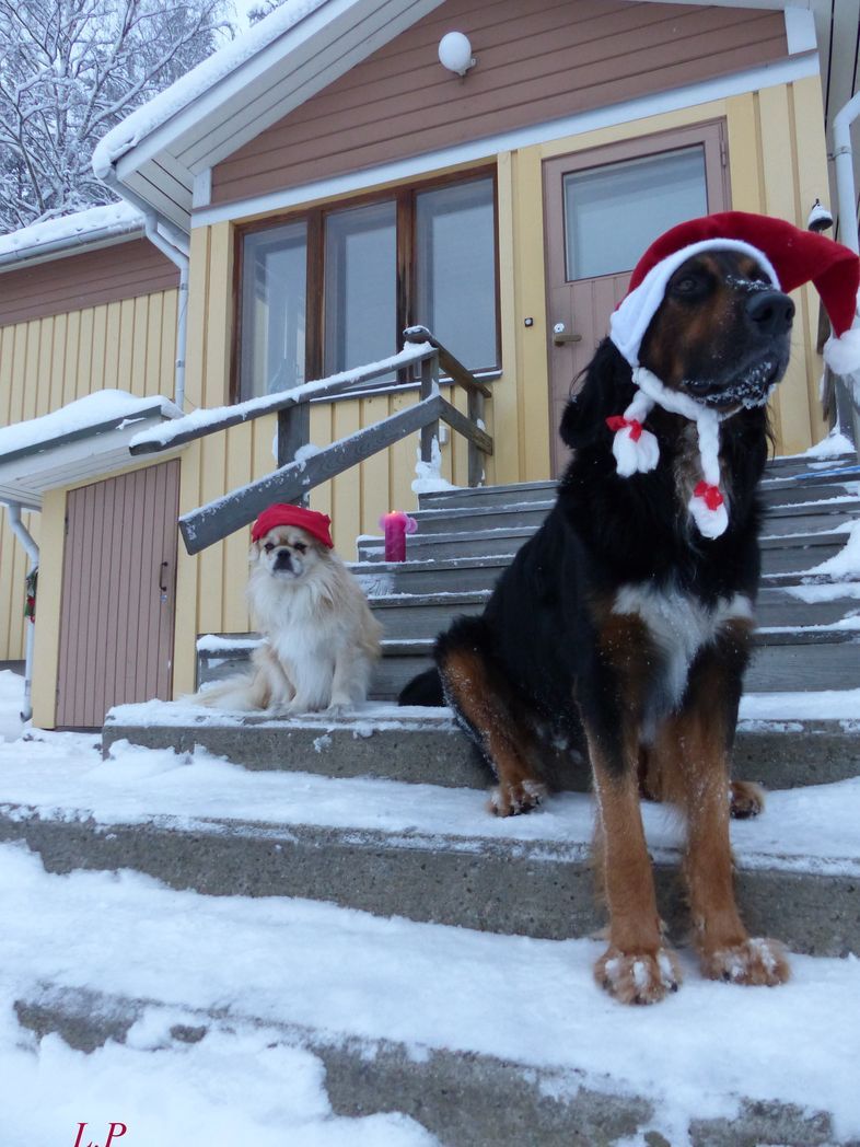 Tontut valmiina jouluntuloon! Tiibetinspanieli Osku ja howavartti Punkki ovat hyviä kavereita, vaikka kokoero on suuri. - Leelia