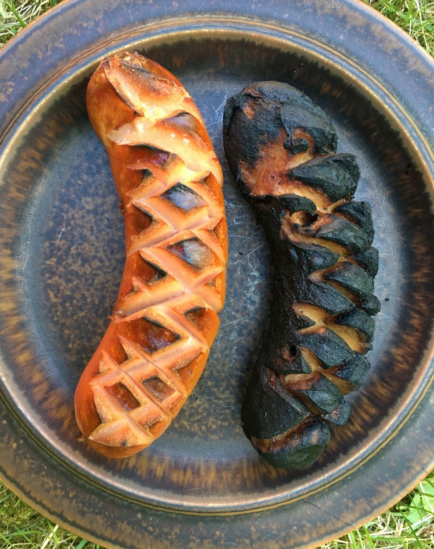 Liekitettyä hiillosmakkaraa, kiitos! Makkarassa on syytä olla mahdollisimman palanut kuori, ja sen täytyy valmistua nopeasti.