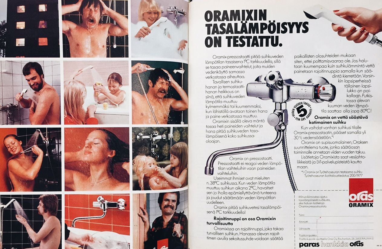 Vanhat Kodin Kuvalehdet ovat hulvatonta materiaalia kaikille retron rakastajille. Vuoden 1978 lehdestä löytyi suihkumainos, jollaista tuskin nykylehdistä löytyisi. Vai mitä tuumit mainoksessa esiintyvien ilmeistä?