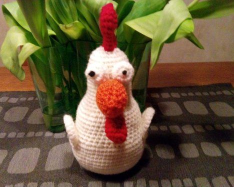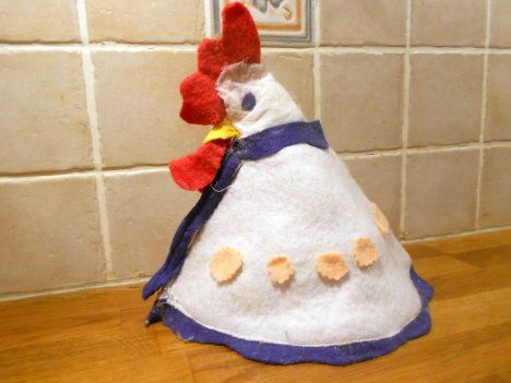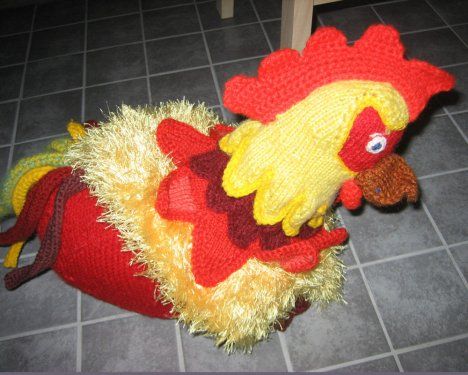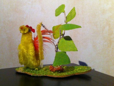 "Kukon malli oli 1990-luvun puolivälissä Käsityökerho-lehdessä, ja silloin tein yhden naapurin lapsille. Nyt tyttäreni lapset tarvitsivat pääsiäiskukkoa. Sovelsin mallia tekemällä kukon mahaan vetoketjullisen taskun, jonne kukko tuo munat ennen pääsiäistä." - Anneli Kivelä, Laitikkala