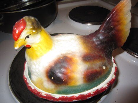 "Huovasta liimailtu kanamunien lämmittäjä on tyttäreni kouluaskartelu 1970-luvun loppupuolelta." - Jaana Porkka, Kuopio