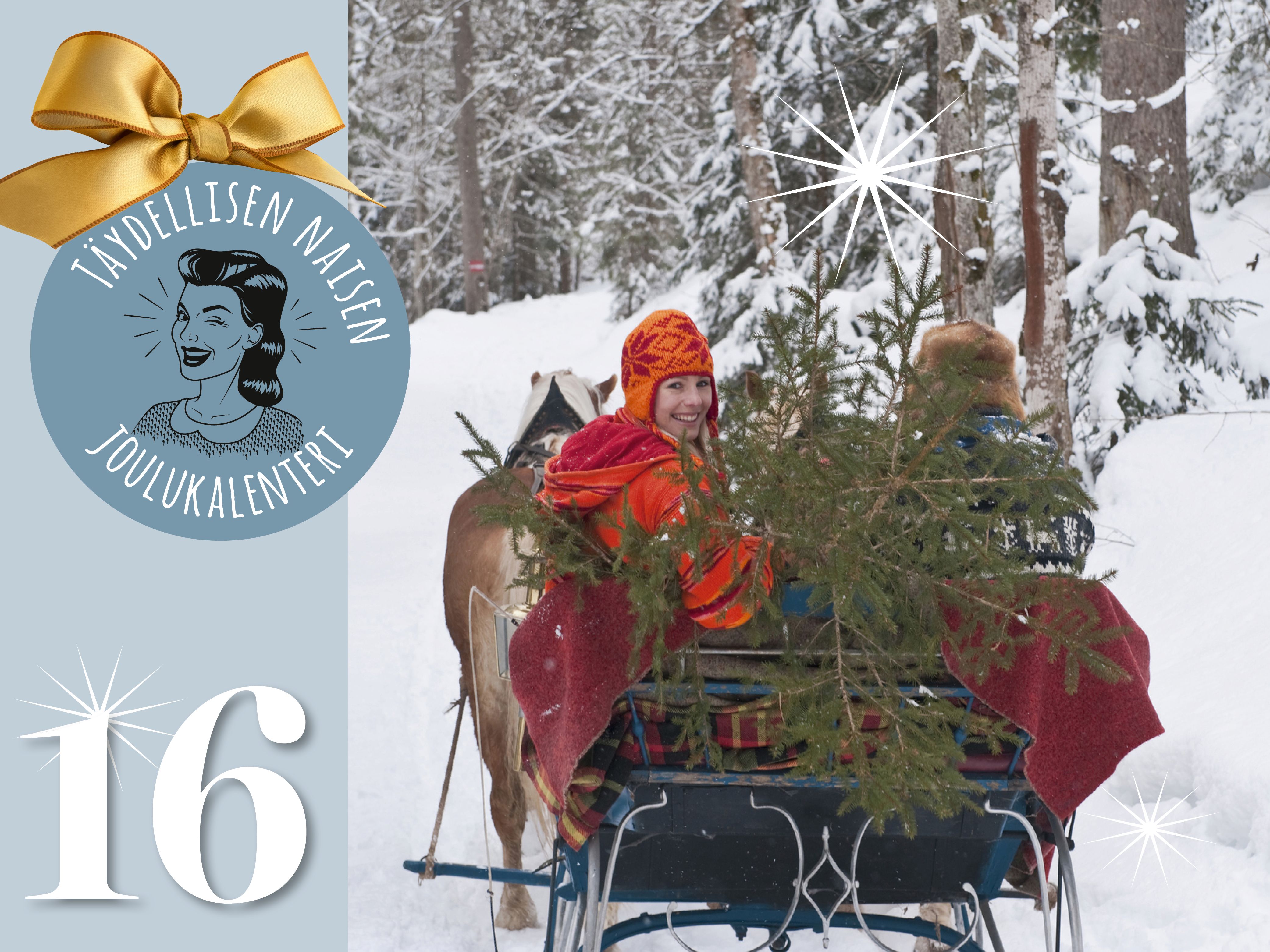 Lapset olivat niin täpinöissään, että heräsivät jo kuudelta avaamaan kalenterin luukun. Sisältä löytyi kauan odotetun kuusenhakupäivän kunniaksi hopeoitu havunoksa. Voi sitä riemua ja halausten määrää, melkein hukun tähän rakkauteen! Vuokrasimme hevosen ja reen ja haimme metsästä olohuoneemme mittoihin täydellisesti sopivan kuusen, jonka olimme istuttaneet 12 vuotta sitten tätä päivää varten. Samalla otimme kätevästi kuvat ensi joulun joulukortteihin.