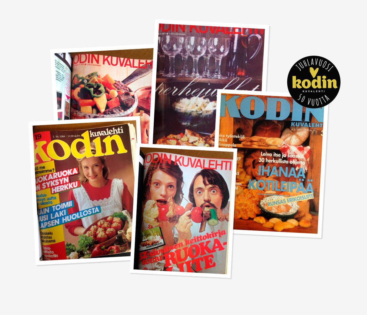 Kodin Kuvalehden juhlavuoden kunniaksi kokosimme 50 vuoden aikana julkaistuja ruoka-aiheisia kansikuvia. Ruokakuvat ovat todellisia ajan kuvia!
