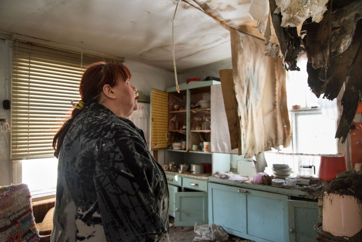 Puiden takaa mökkiä ei melkein näy. Lähempänä paljastuu, että seinien punainen on haalistunut ruskeaksi ja kuistin pääty romahtanut alas.