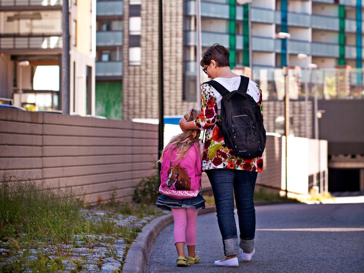 Kymmentä vailla kuusi suljemme kerrostalokotimme ulko-oven Espoon Perkkaalla ja lähdemme kävelemään kohti päiväkotia. Kun Siiri oli nuorempi, hän istui rattaissa tai pyörän turvaistuimessa, ja matka eteni rivakasti. Nyt kuljemme usein peräkanaa, minä kymmenen metriä edellä Siiriä henkisesti perässäni vetäen. Olemme perillä vuoropäiväkodissa varttia yli kuusi. Tutut hoitajat ottavat Siirin vastaan, ja pääsen jatkamaan kiiruhtaen matkaa.