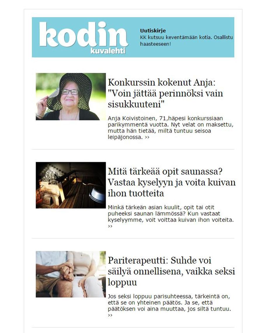 Ellet vielä saa Kodin Kuvalehden uutiskirjettä, tilaa se nyt. Uutiskirjeen avulla pysyt vaivatta kärryillä siitä, mitä lempisaitillasi tapahtuu.