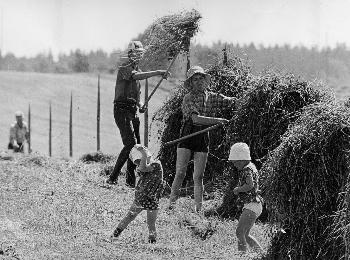 ”Olimme koko perhe heinätöissä, ja pellolla tuoksui kuiva heinä. Korissa oli äitille ja isälle Airamissa kahvia. Meille lapsille oli piimää ja äitin leipomaa leipää”, Sari kertoo onnellisista päivistä heinäpellolla. Aherruksen jälkeen nautittiin myös korjatun heinän tuoksusta ladossa.