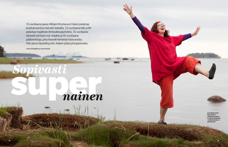 Nyt hän istuu kotisohvallaan Itä-Helsingissä, leiskuvanpunaisessa kerrostaloasunnossa. Nauraa kovaa ja puhuu paljon, kuulemma tuplasti enemmän kuin aviomiehensä, uskontofilosofi Mikko Telaranta, joka on sulkeutunut työhuoneeseensa viimeistelemään väitöskirjaansa. Tänään Jaana-Mirjamia jurppii aamun lehti.