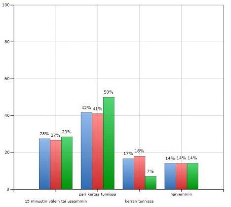 | 15 min välein tai useammin | 28 % | 27 % | 29 % |