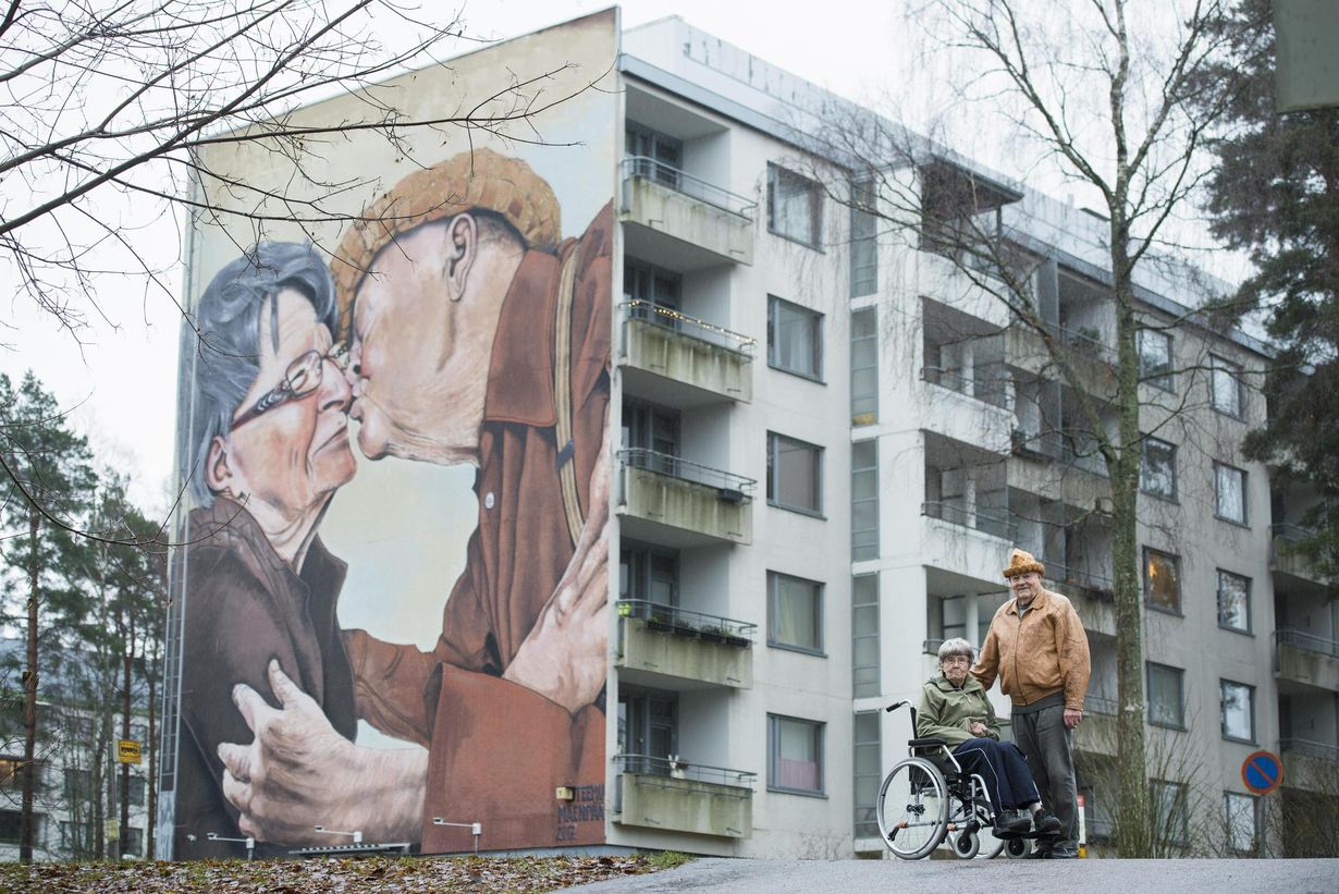 Ritva: Yhtenä iltana Esko tuli kotiin mukanaan taiteilija, joka halusi ottaa valokuvan meistä. Kuvassa Esko antaa minulle suukon. Reilun viikon päästä kuva oli maalattu kotitalomme seinään. Sanovat sitä muraaliksi. Moni on tunnistanut meidät siitä, ja olemme saaneet kehuja, että olimme juuri oikeat ihmiset kuvaan, koska olemme talon ensimmäiset asukkaat. Huomionosoitus tuntuu hyvältä myös meistä.