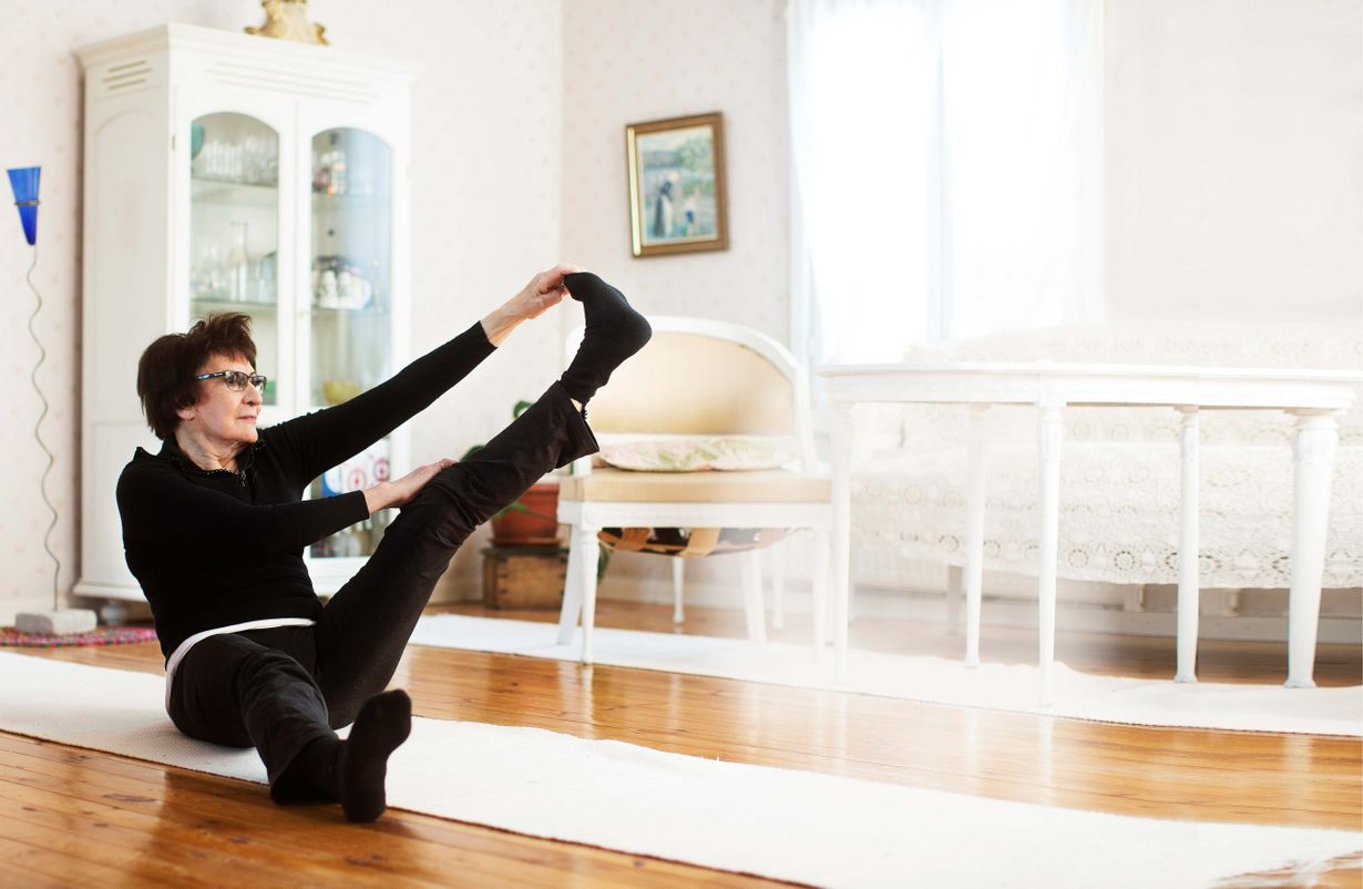 Ikä ei ole este joogamatolla taivuttelulle. Eila Simola on 91-vuotias, vetää edelleen jumppia ja kantaa polttopuut navetasta.