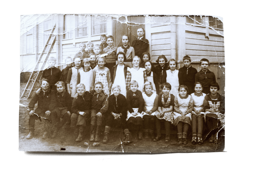 Monella tytöllä on yllään essu. He ovat Linikkalan kansakoulun kolmasluokkalaisia, on vuosi 1937.