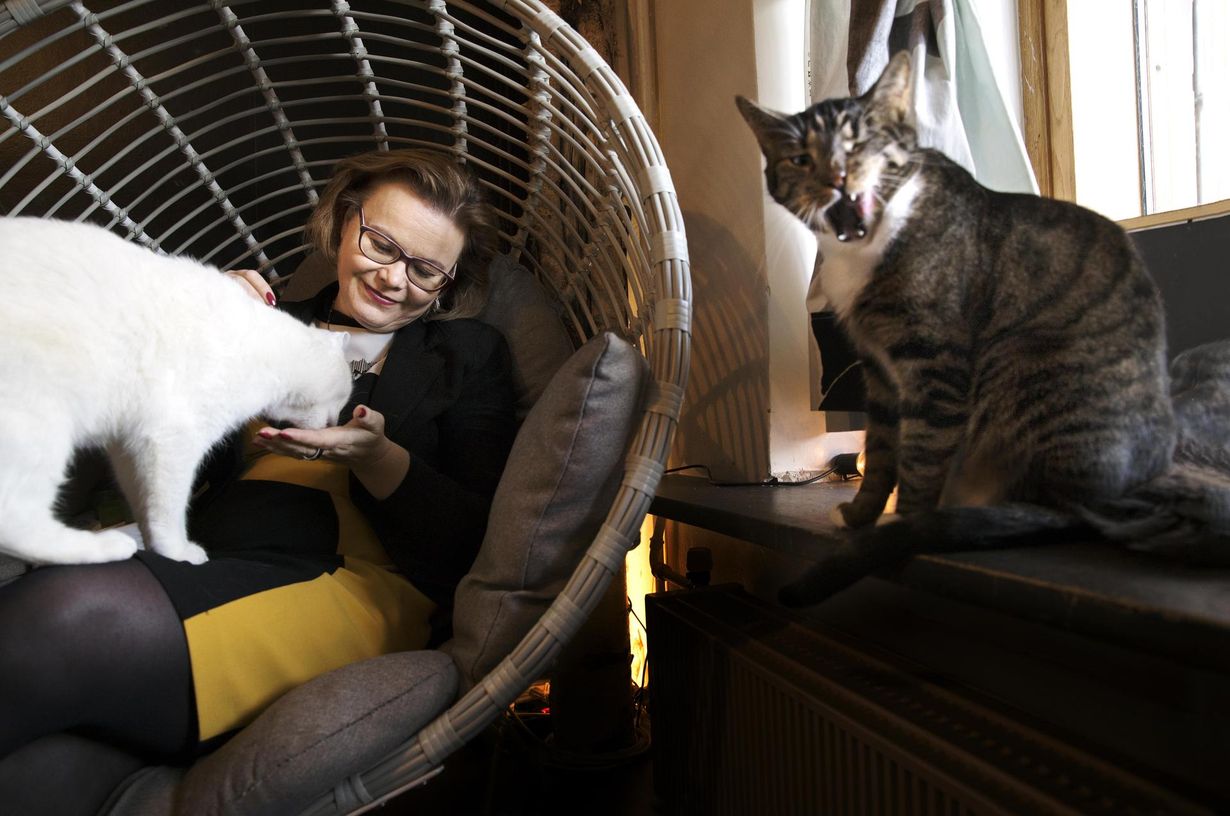 Minna Huotilainen on vakuuttunut siitä, että kissojen silittely vähentää stressiä. Helsinkiläisessä kissakahvila Helkatissa hän silittelee vieraita kissoja, mutta on hänellä kotonakin yksi persoonallinen kissayksilö Iiris.